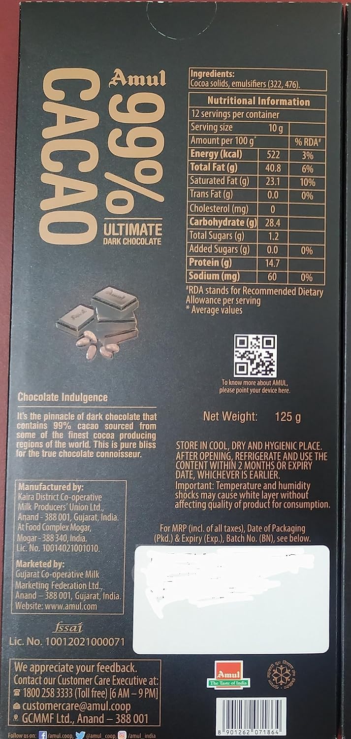 Amul 99% Cacao is an exceptional chocolate experience that delights you with the full-bodied rich taste & strength of single origin cocoa beans. Best enjoyed nibbled, to truly appreciate the striking notes of fresh, pure cocoa. Amul 99% Cacao has zero sugar and is a delight for extremely dark and bitter chocolate connoisseurs. Try this only if you have enjoyed Amul dark 55%, Amul Bitter 75% and Amul 90% Bitter chocolates. It is really really Bitter and Bitter at its best.