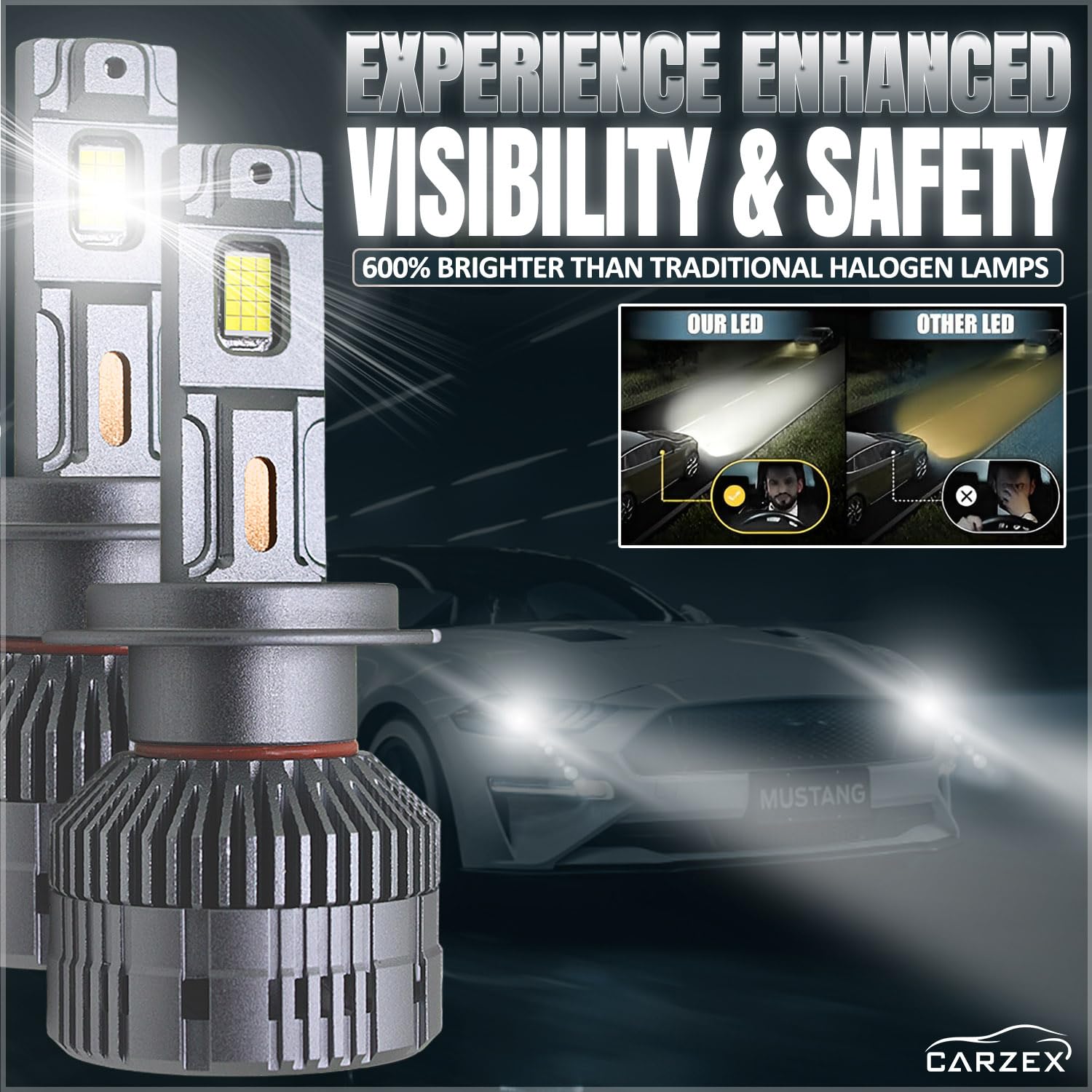 HIGH-POWER CSP LED CHIPS: ⇰ Engineered with advanced CSP LED chips delivering 500% more brightness than standard H7 bulbs. Provides high focus and maximum light output with a wider, farther-reaching beam, ensuring safer and clearer night driving for enhanced road safety.