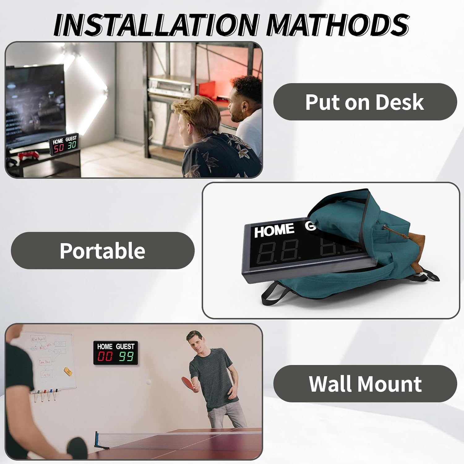 Easy to Install:Included a set of wall mount scrws. You can hang the electric scoreboard on the wall or just put it on table. Besides plugged in the outlet, you can also use the power bank to supply the digital scoreboard.
