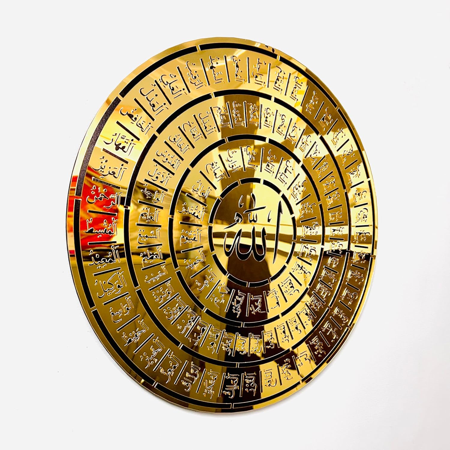Allah 99 Names Wall Art | Islamic Calligraphy | Gold Finish Enhance your home or office with this stunning circular Islamic Calligraphy Art, featuring the 99 Names of Allah (Asma ul Husna) in intricate design. The central highlight is the name “Allah” surrounded by 99 beautiful Arabic calligraphy names, symbolizing divine attributes. The gold metallic finish gives it an elegant and luxurious feel, perfect for Islamic decor lovers. Ideal for gifting on Eid, Ramadan, housewarmings, or as a personal reminder of faith