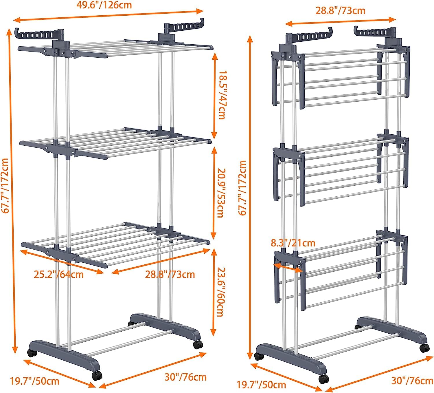 ๐๐ฏ๐๐ซ๐ฌ๐ข๐ณ๐๐ ๐-๐๐ข๐๐ซ ๐๐๐ฉ๐๐๐ข๐ญ๐ฒ: Designed with ample drying space (67.7โH x 19.7โW x 30โL), this rack features 3 tiers design,2 side wings with 14 hooks, and 24 rods, allowing you to air-dry up to 62 items at onceโideal for family-sized laundry.