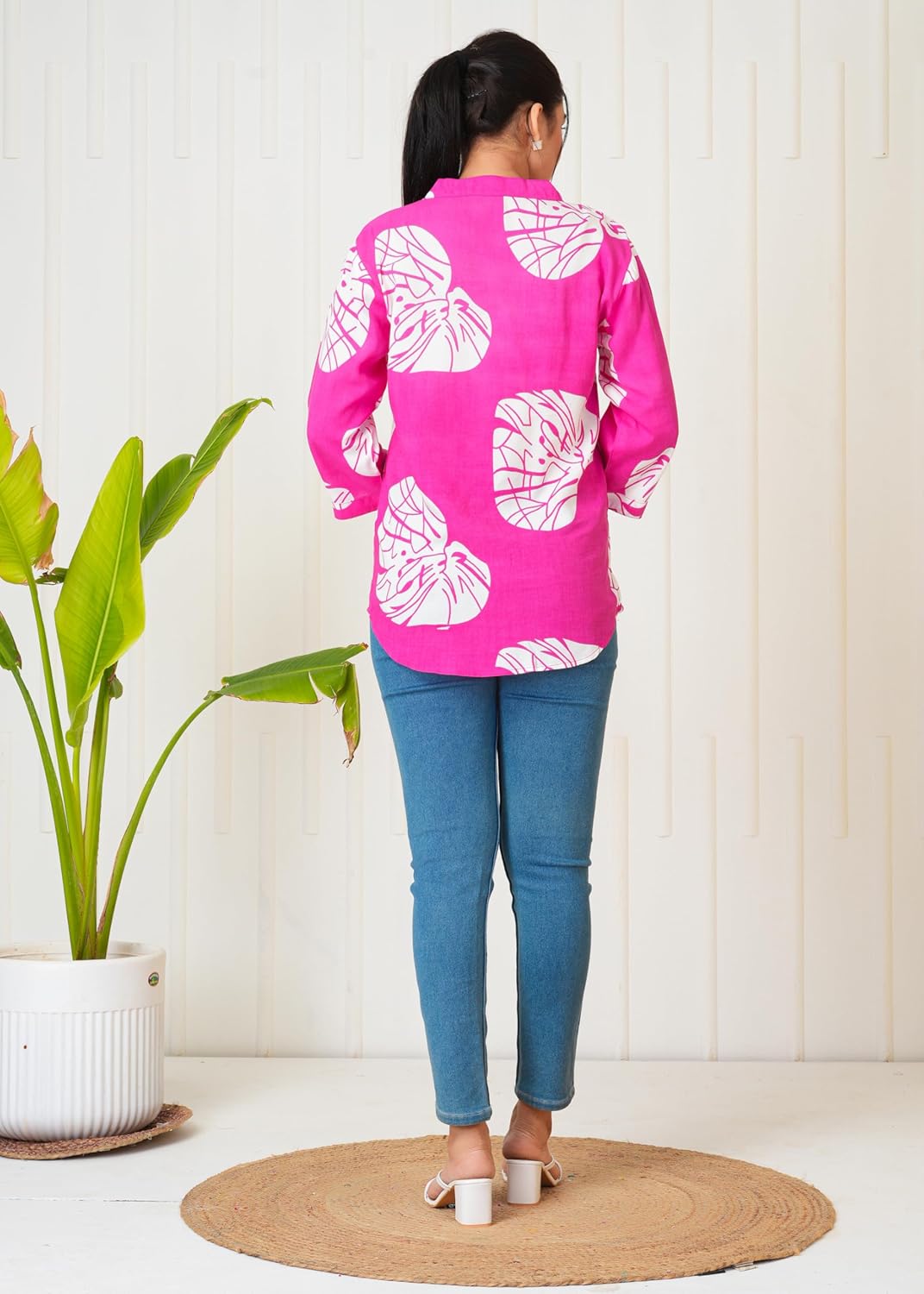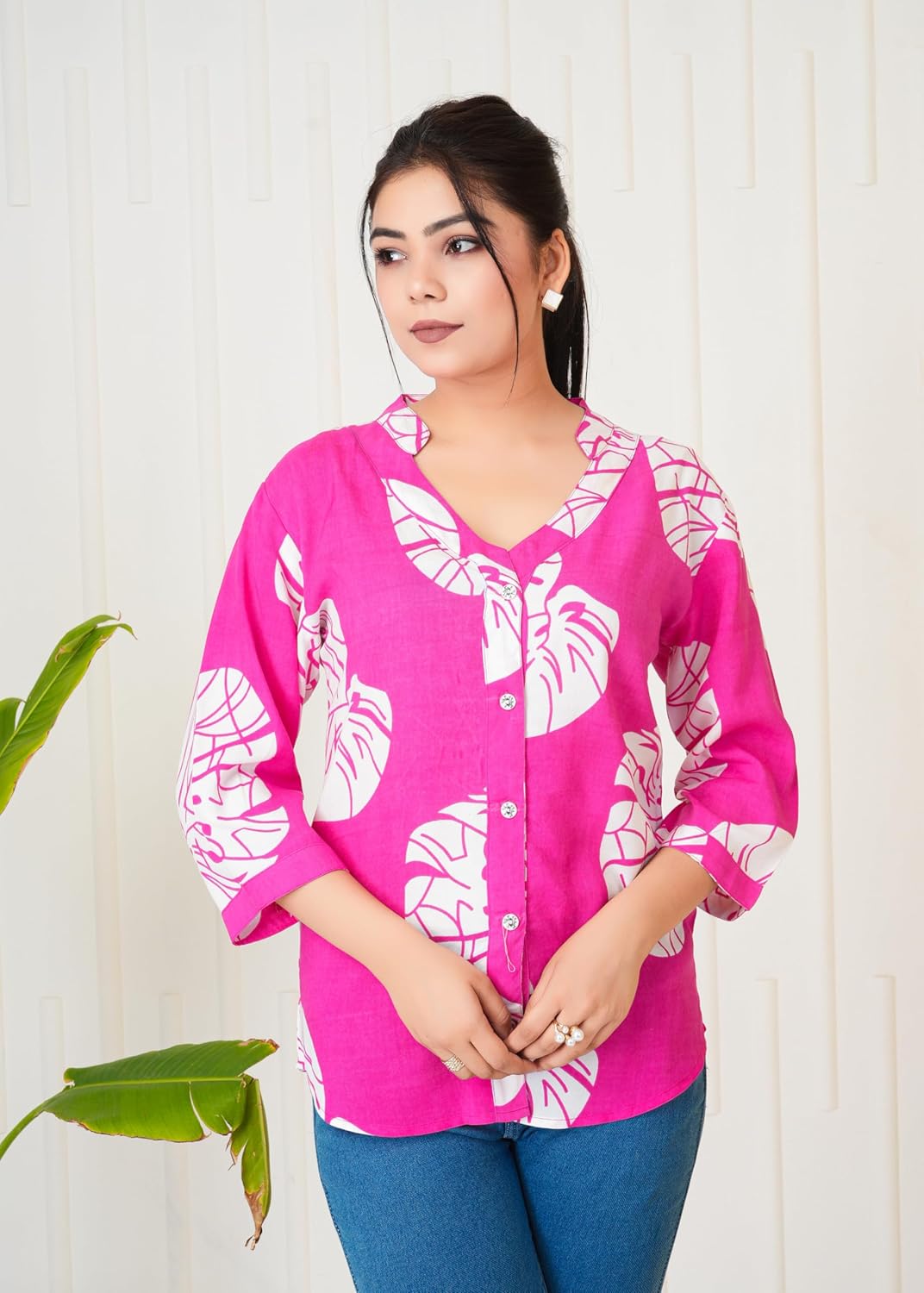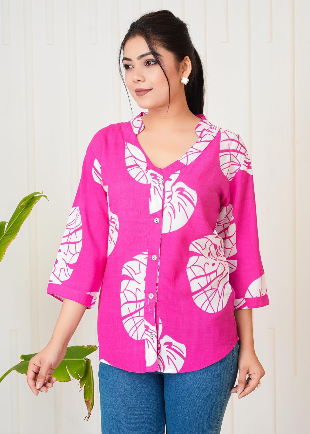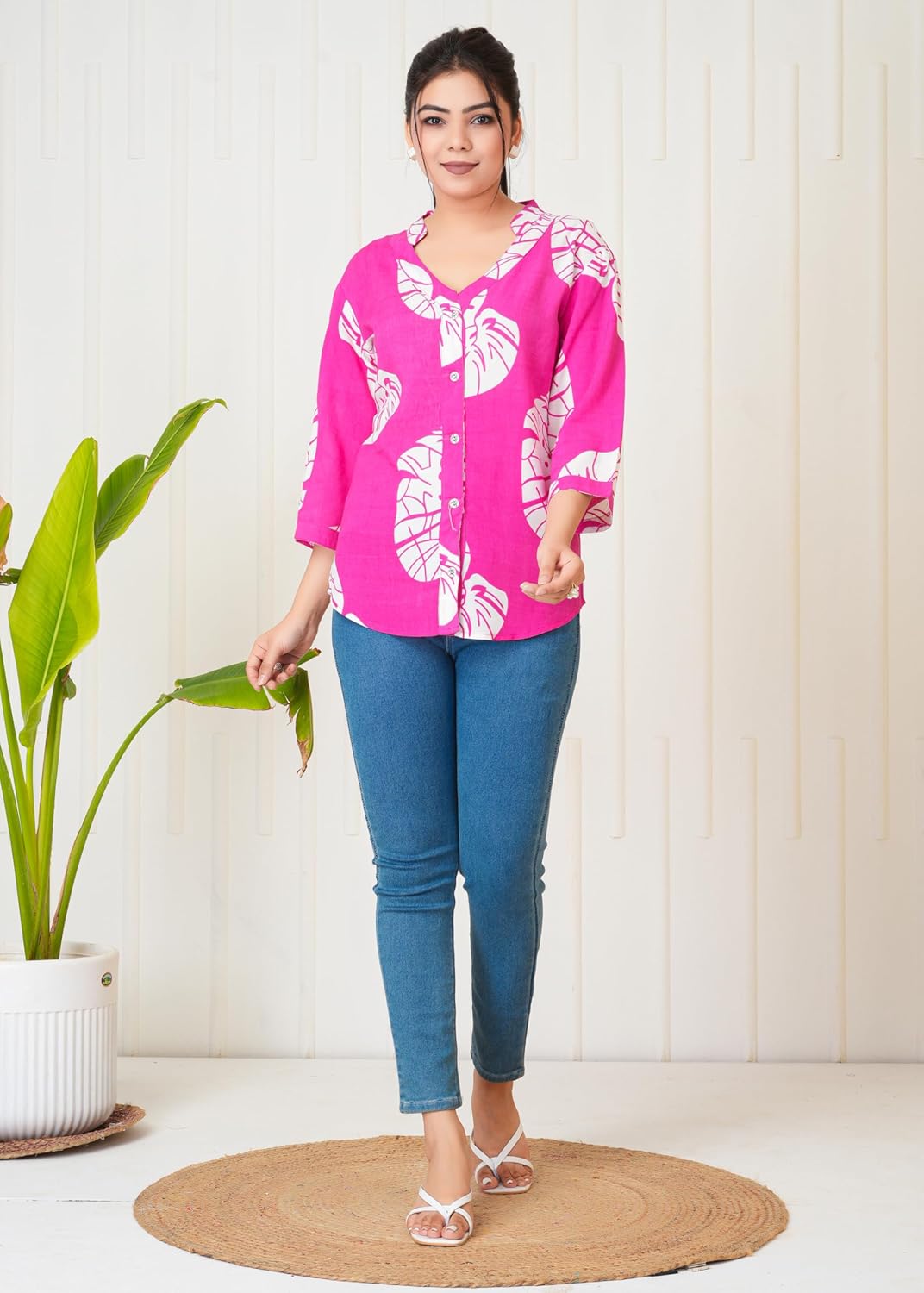 This casual, regular-sleeved women’s top features a vibrant floral print in a stunning multicolour palette of pink, orange, blue, and cream hues. The relaxed fit and lightweight fabric make it a comfortable and stylish choice for everyday wear. With its eye-catching design and flattering V-neckline, this top is perfect for creating chic and effortless ensembles. Pair it with jeans or skirts for a casual yet put-together look. Crafted with care, this top offers a delightful blend of fashion and comfort. Its versatile nature allows you to dress it up or down, making it a versatile addition to your wardrobe. Measurements provided ensure a proper fit.