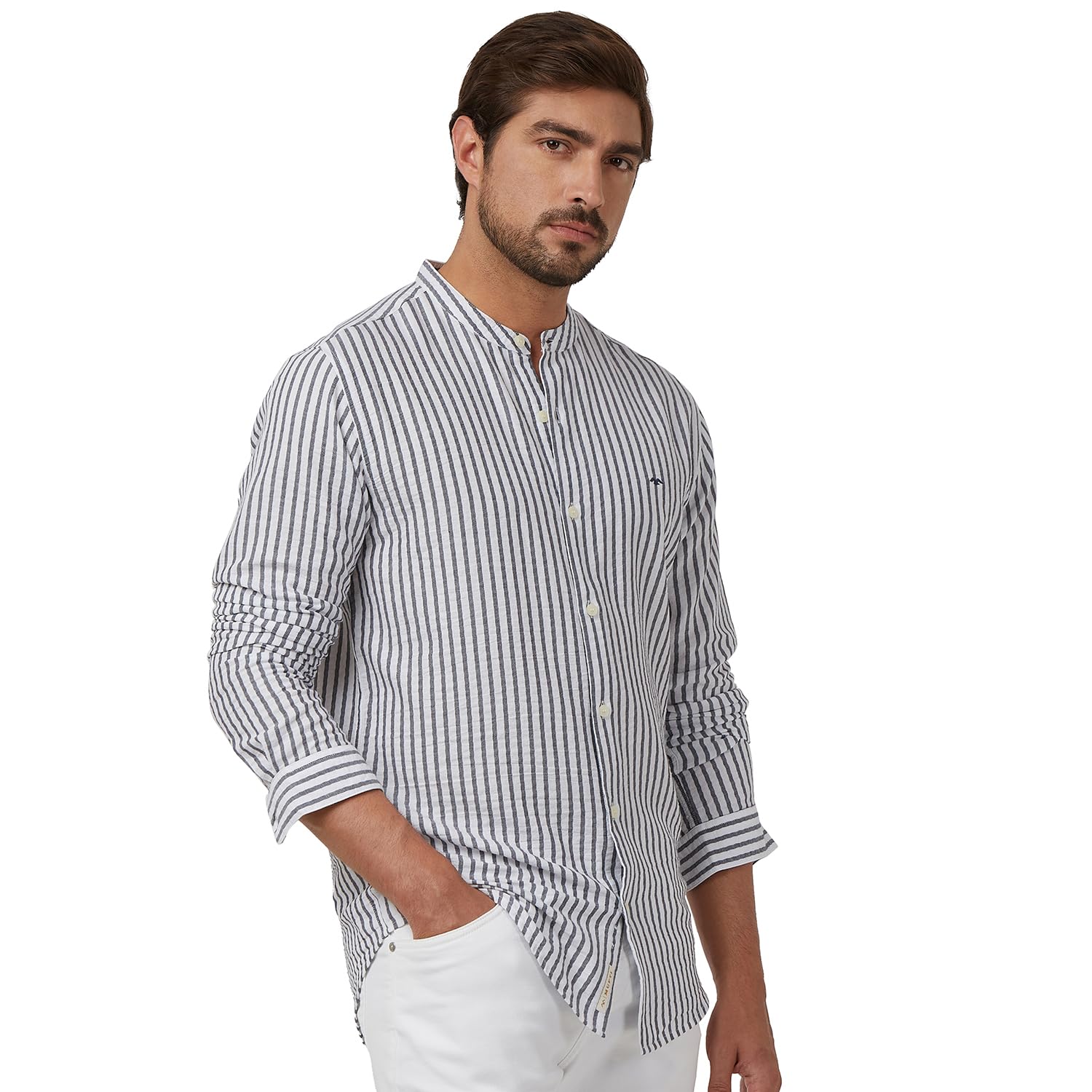 Mufti Men’S Casual Slim Fit No Pocket Special Softener Washed Textured Stripe Cotton Elastane Full Sleeve White Mfs-15241-T
