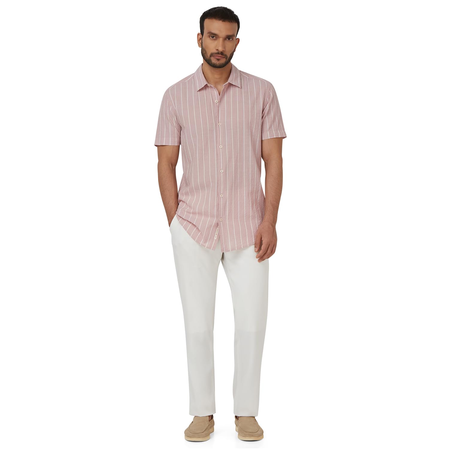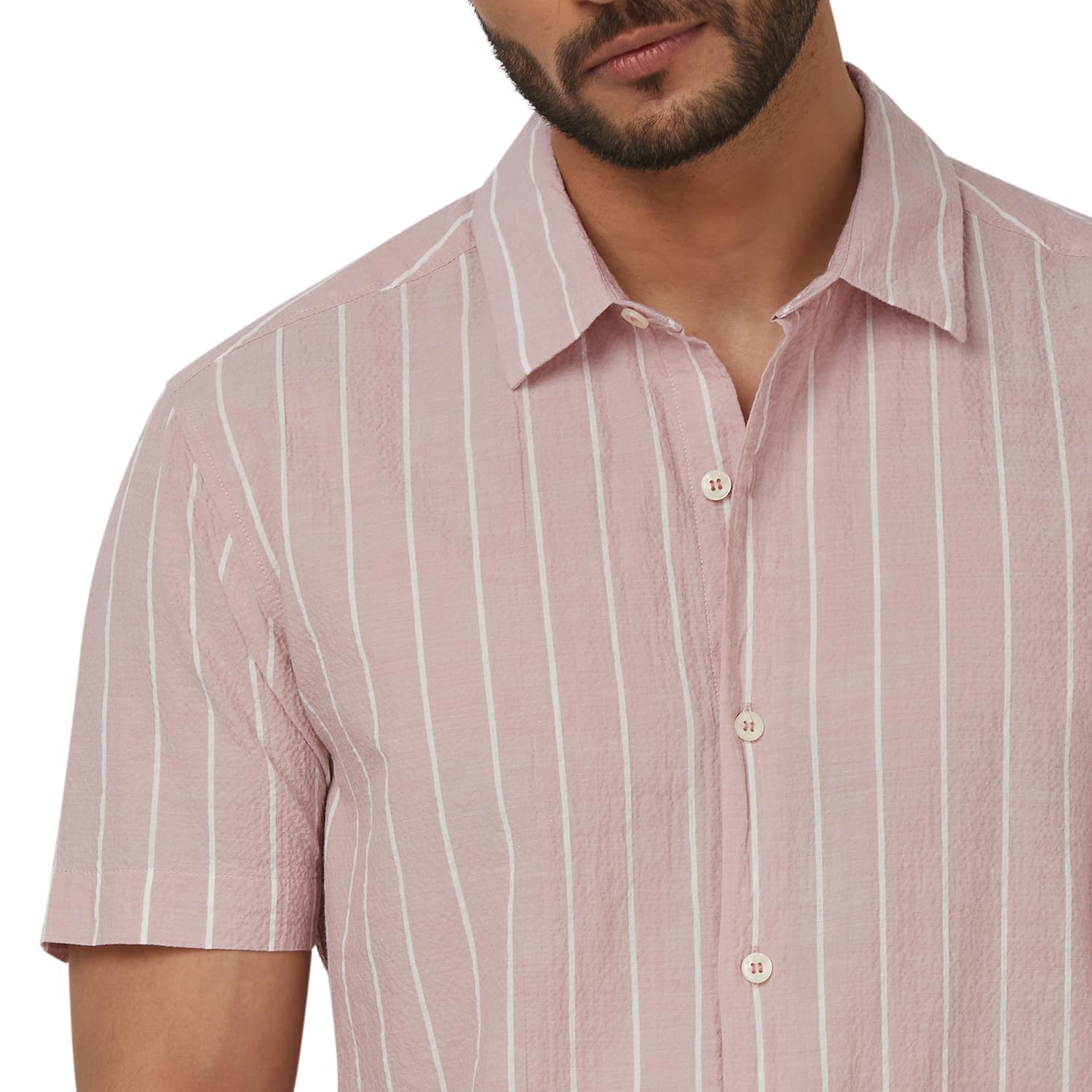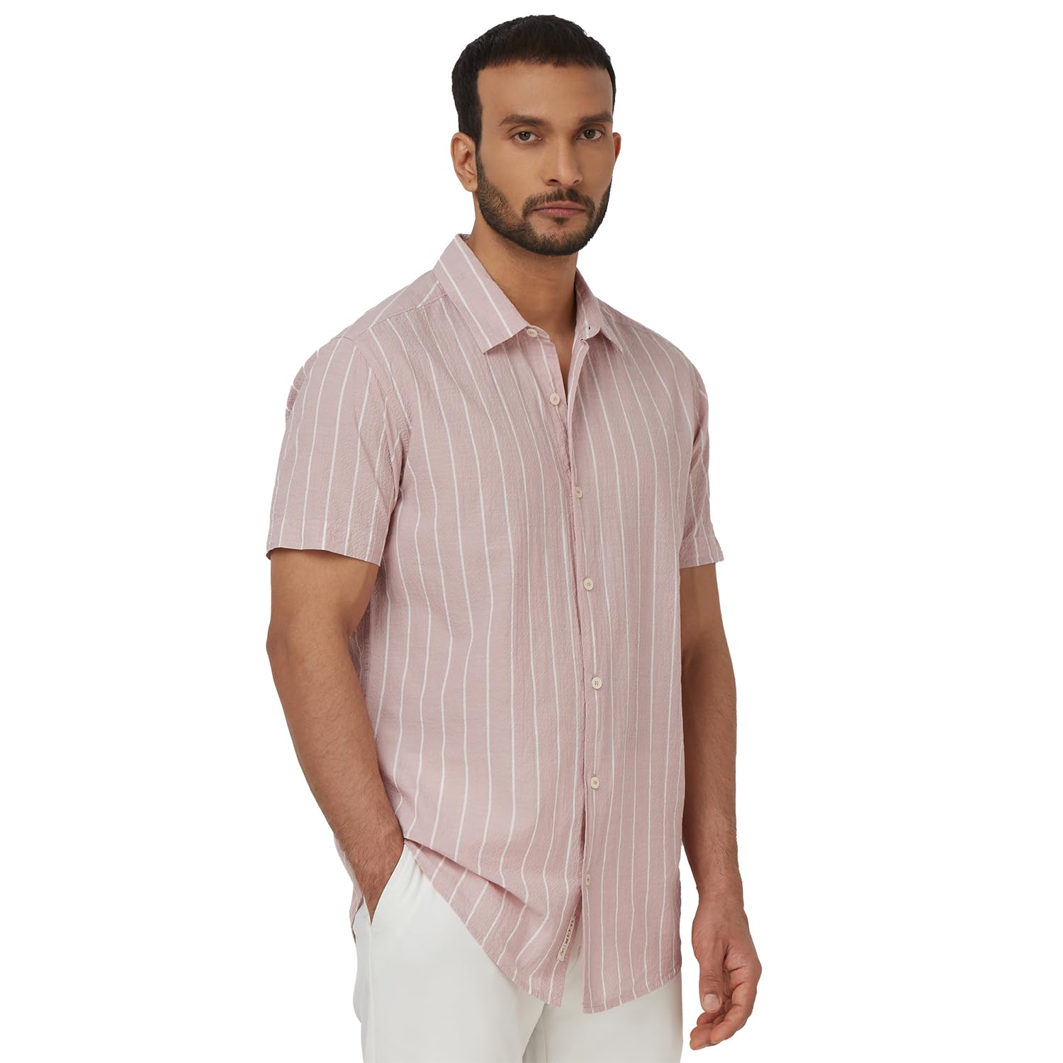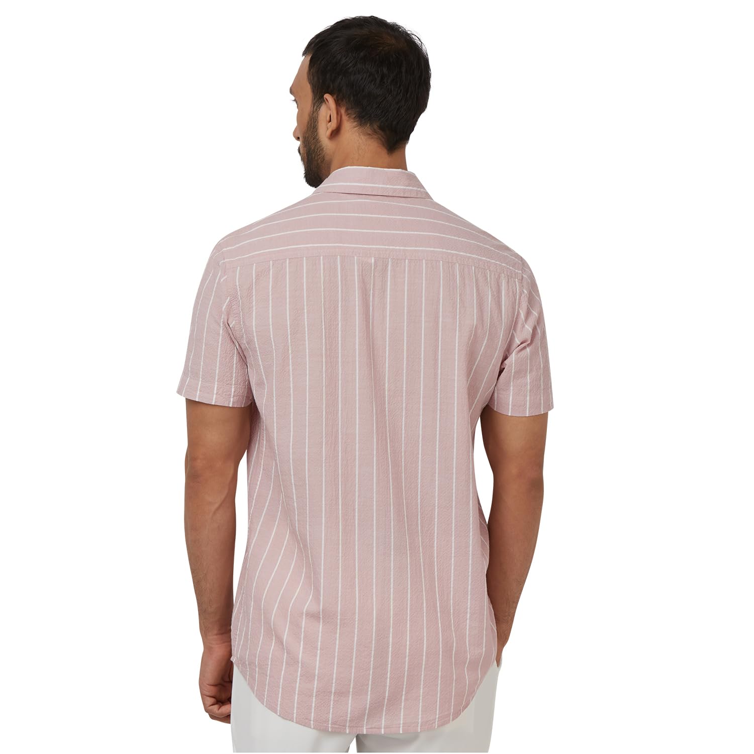 Mufti Men’S Casual Half Sleeve No Pocket Special Softener Washed Pink Textured Stripe Slim Fit Casual Shirt Mfs-15229-T
