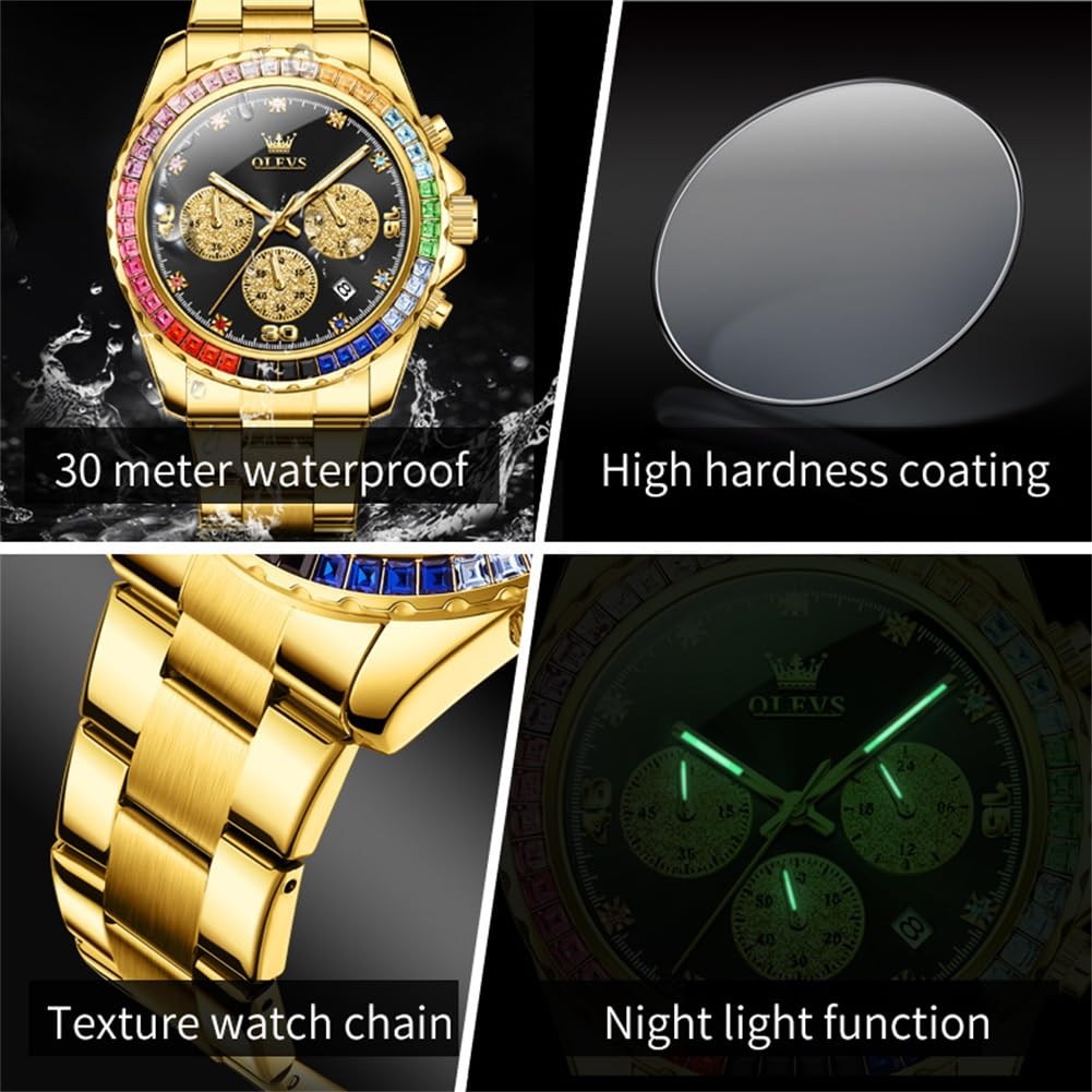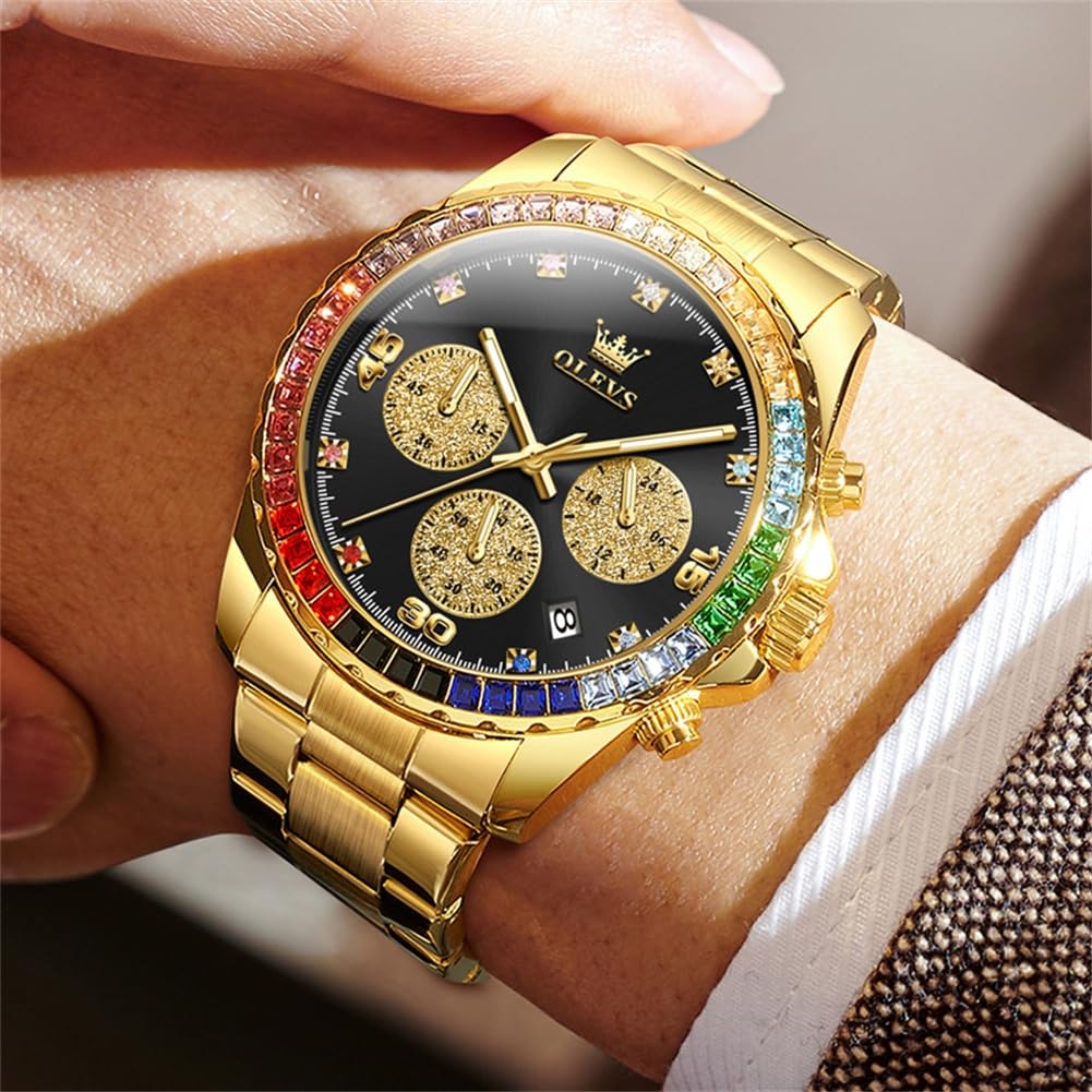 OLEVS Watch for Men Luxury Gold Diamond Chronograph Business Wristwatch with Analog Quartz, Date Calendar, Stainless Steel Band, Luminous Hands, Waterproof