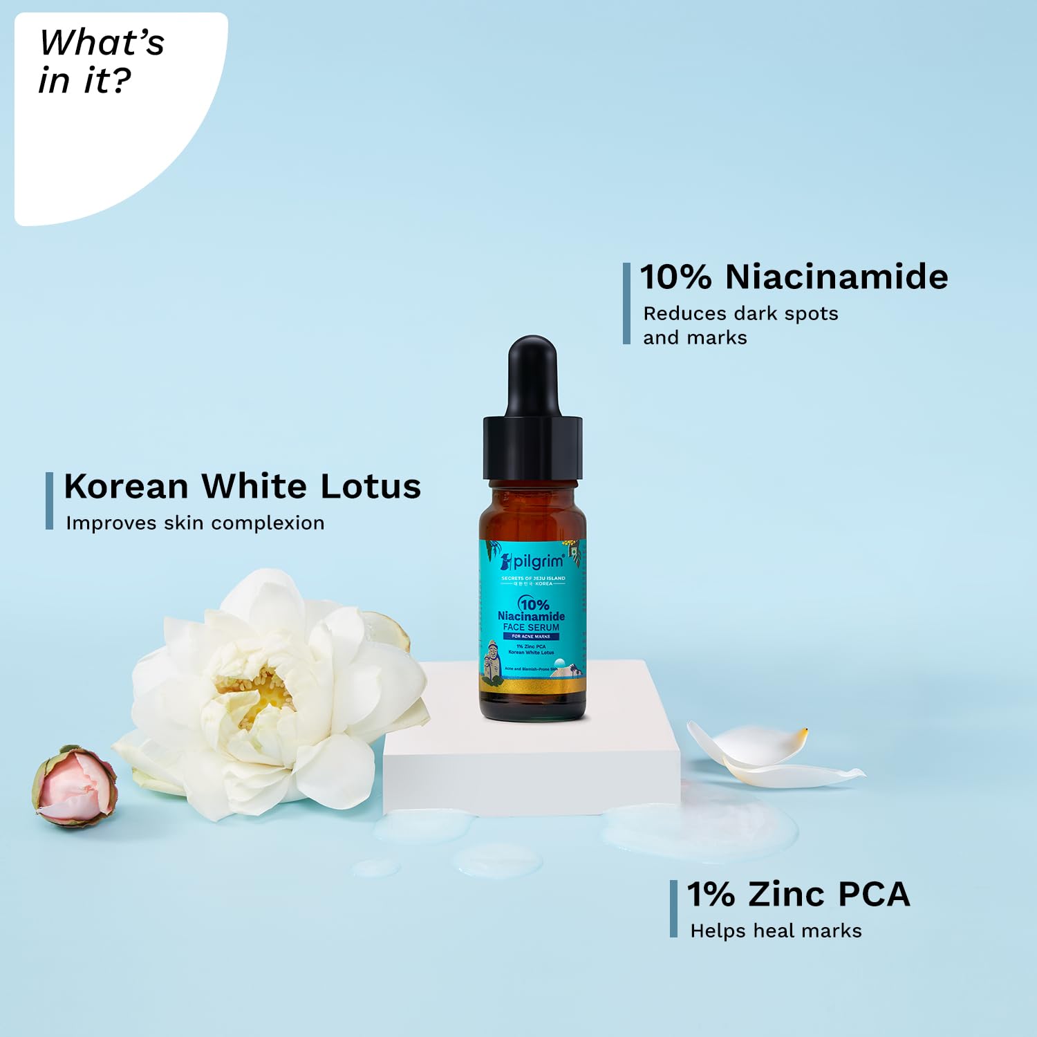 KOREAN SERUM FOR ACNE MARKS: 10% Niacinamide (Vitamin B3) combined with 1% Zinc PCA work to fade acne marks and dark spots. BRIGHTENS & EVENS SKIN TONE: Niacinamide and Korean White Lotus work together to brighten the skin and enhance its overall radiance. OIL CONTROL: This serum, with 1% Zinc PCA and Salicylic Acid, regulates oil production, perfect for acne-prone and oily skin. 10% NIACINAMIDE: 10% Niacinamide, a form of Vitamin B3, reduces acne marks, evens skin tone, and enhances skin health. 1% ZINC PCA: 1% Zinc PCA, used in skincare, regulates oil production, keeps skin hydrated, and offers antimicrobial properties. KOREAN WHITE LOTUS: Korean White Lotus flower has powerful antioxidants that act like a natural skin conditioner and help enhance radiance. NON-TOXIC: The serum is dermatologically approved, non-toxic and fragrance-free. HOW TO USE: Apply 3-5 drops to cleansed face and neck. Pat it in gently. Use a broad spectrum sunscreen SPF30+ while using this product.