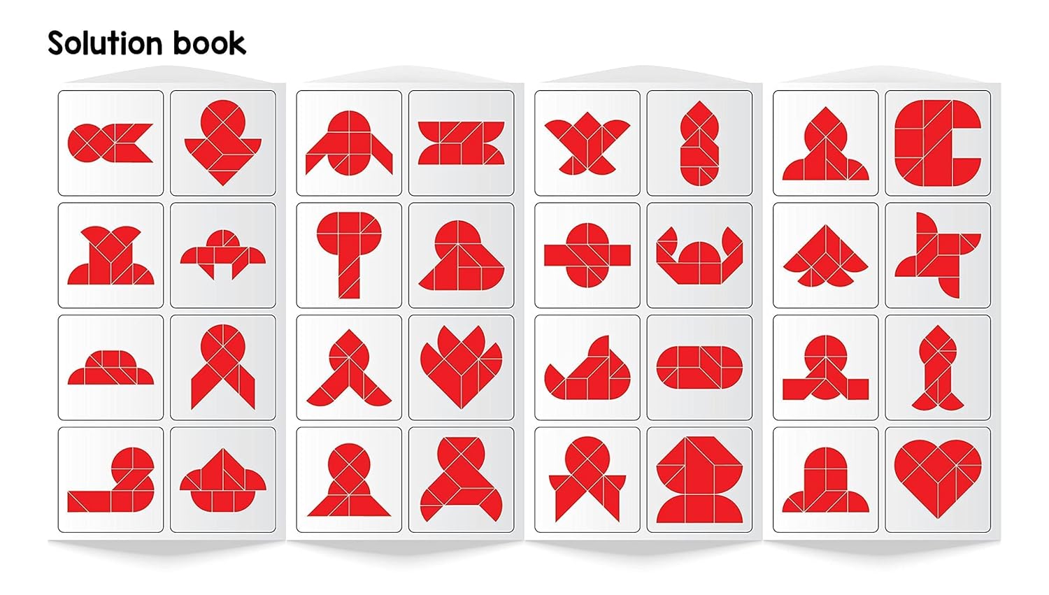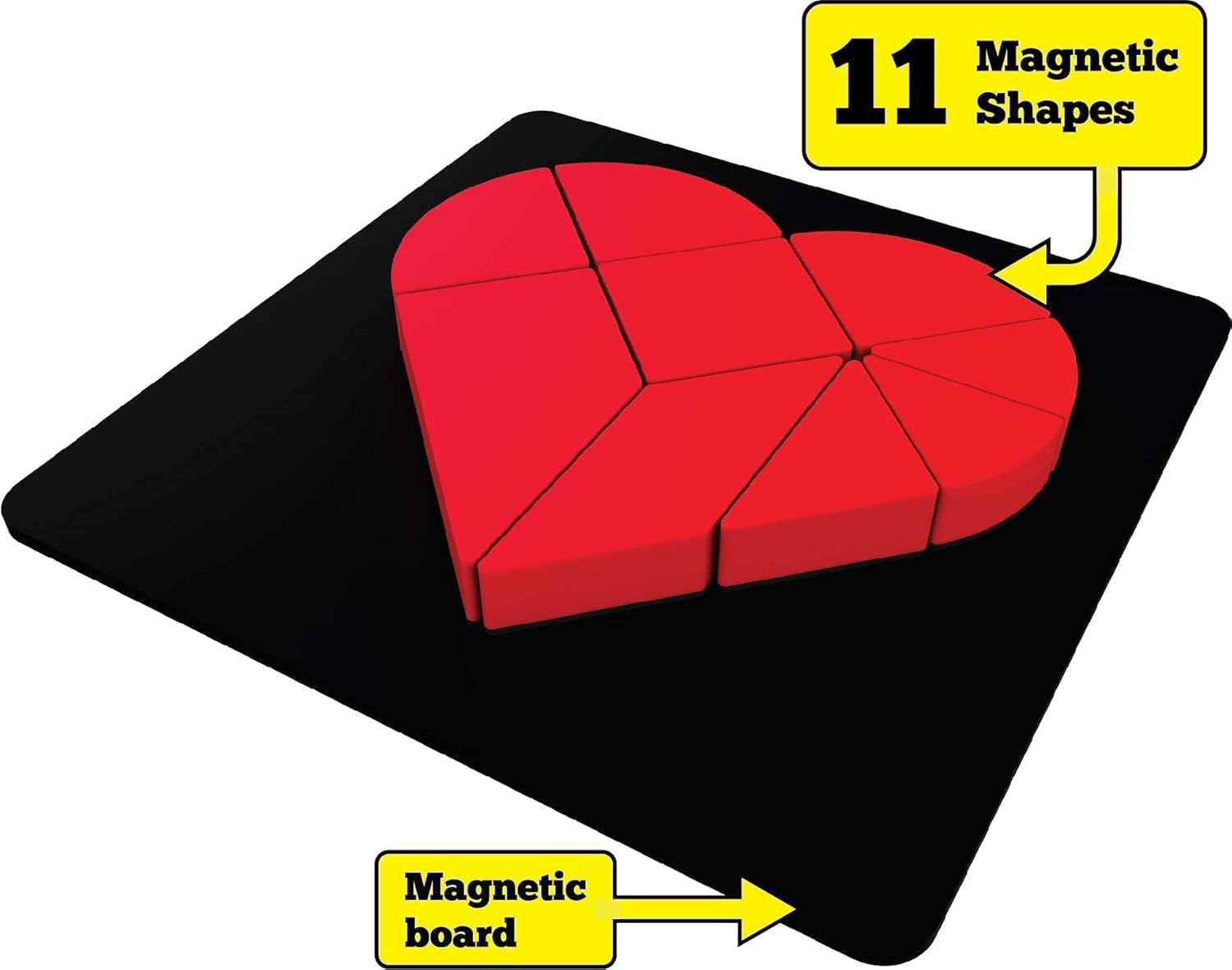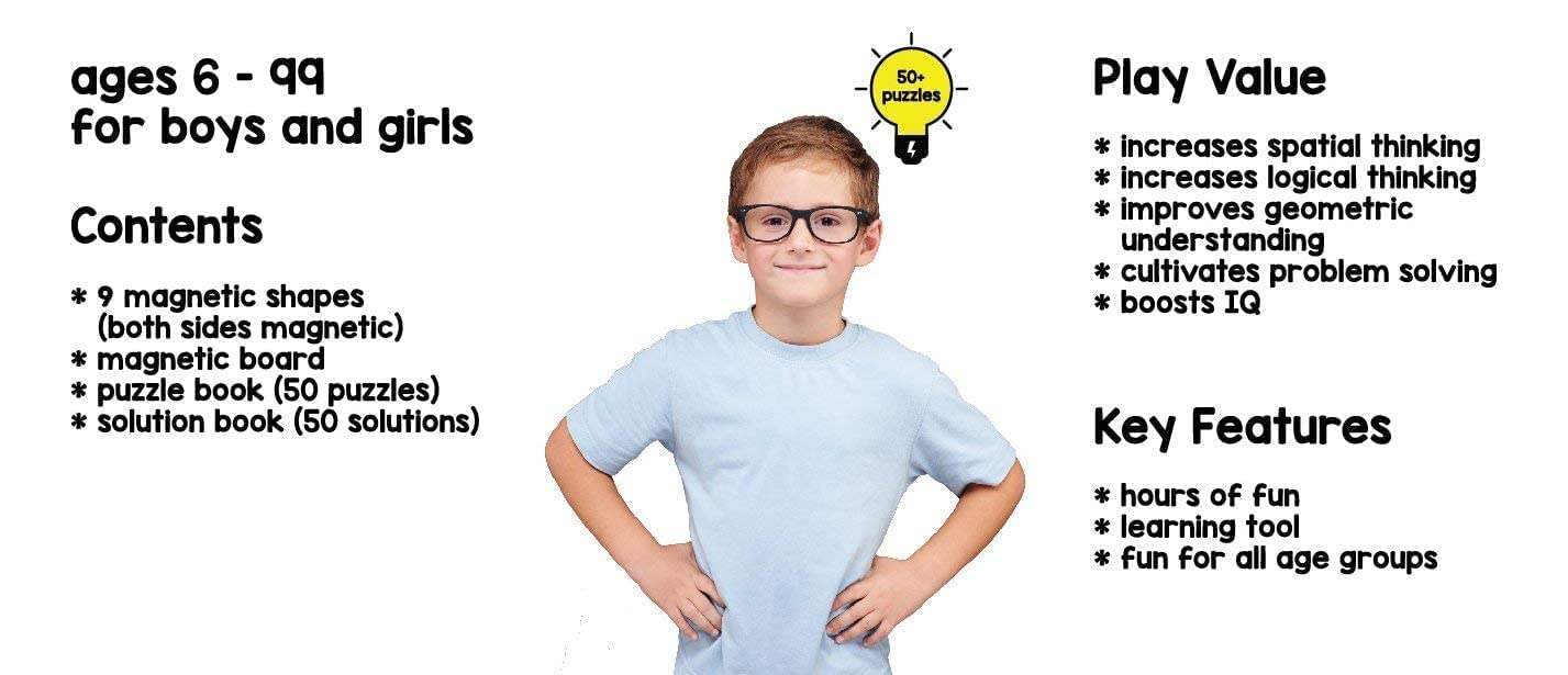 Each set includes 11 Magnetic shapes, a magnetic canvas (9X9 inches), a puzzle book with 56 puzzles, a solution book with 56 solutions.