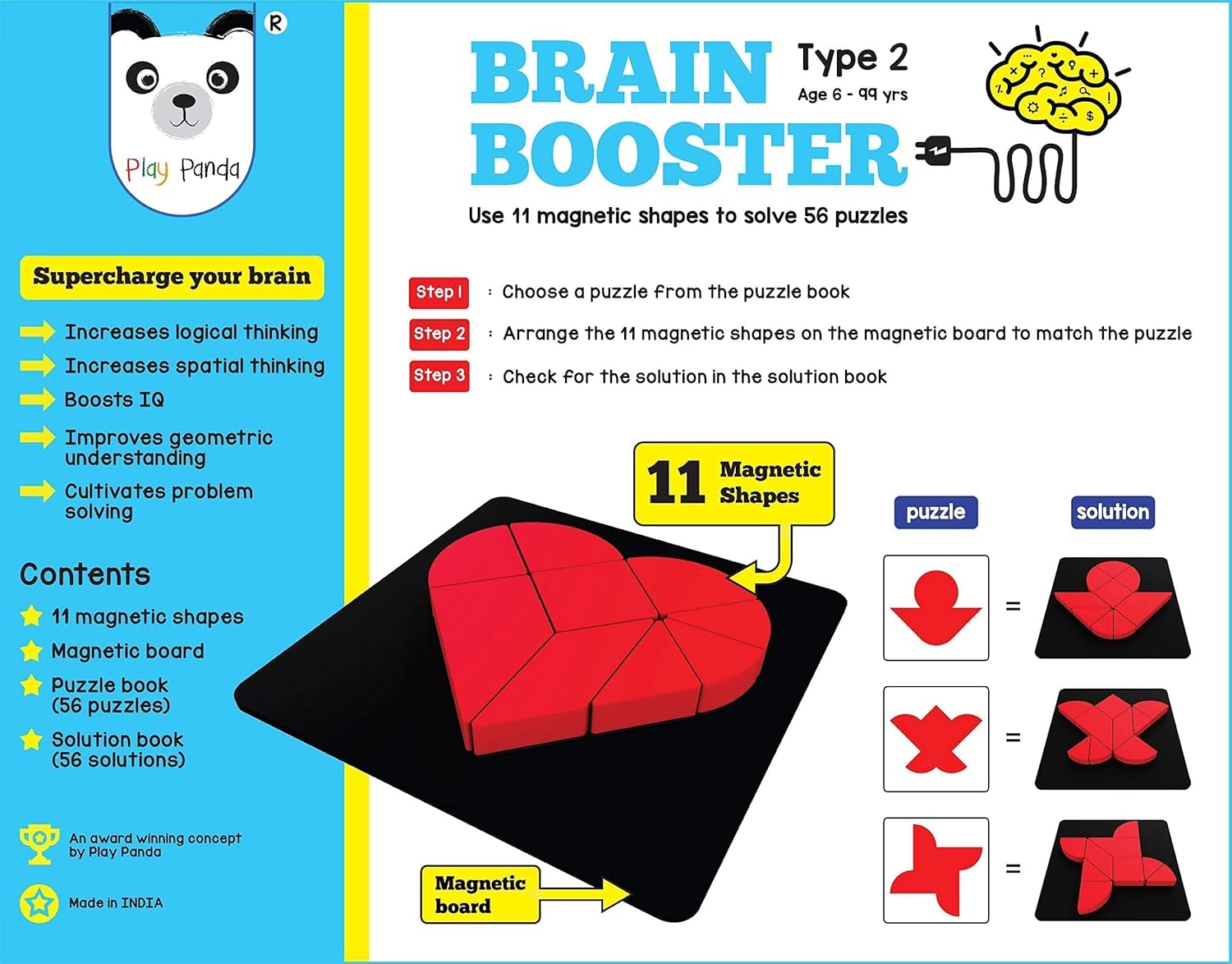 How to play ?Choose a puzzle from the Puzzle book (56 puzzles). Arrange 7 magnetic shapes on the magnetic board to match the puzzle. Check for the solution in the solution book.You can play Brain Booster puzzles in two player mode.1. Pick a puzzle for the opponent to solve and vice versa. 2. Keep a time limit. 3. After the time is up, check the solution. The player will get 10 points for every shape in the correct position. 4. After 3 rounds, the player with the highest score wins.Key FeaturesBrain Booster promises hours of fun. It helps children develop their spatial and logical thinking skills. It improves their geometric understanding and problem solving skills. Even teenagers and adults will find brain boosters engaging. Brain Booster puzzles are sure to challenge their brain.ImportantRecommended age : 6 – 99 yearsIdeal for both boys and girlsThis product is designed and manufactured in IndiaContents11 magnetic shapesMagnetic board (size 9X9 inches)Puzzle book with 56 puzzlesSolution book with 56 solutions