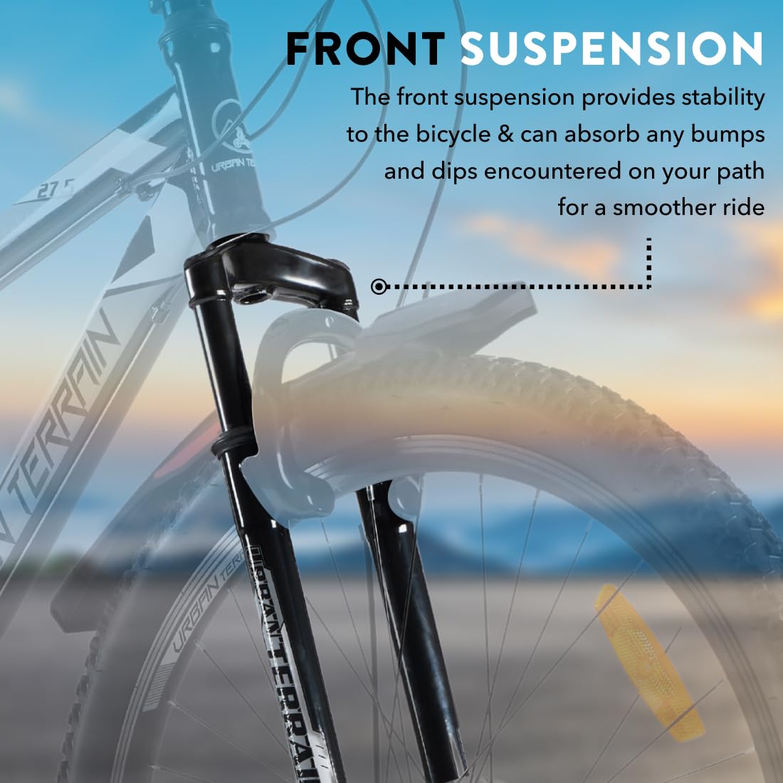 The front suspension provides stability to the bicycle and can absorb any bumps and dips encountered on your path for a smoother ride . It also provides strong pedal powers for strong acceleration on straight surfaces and uphill climbs