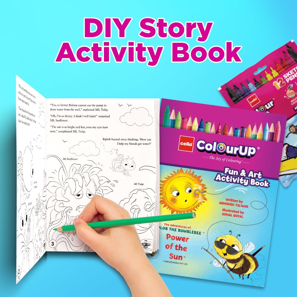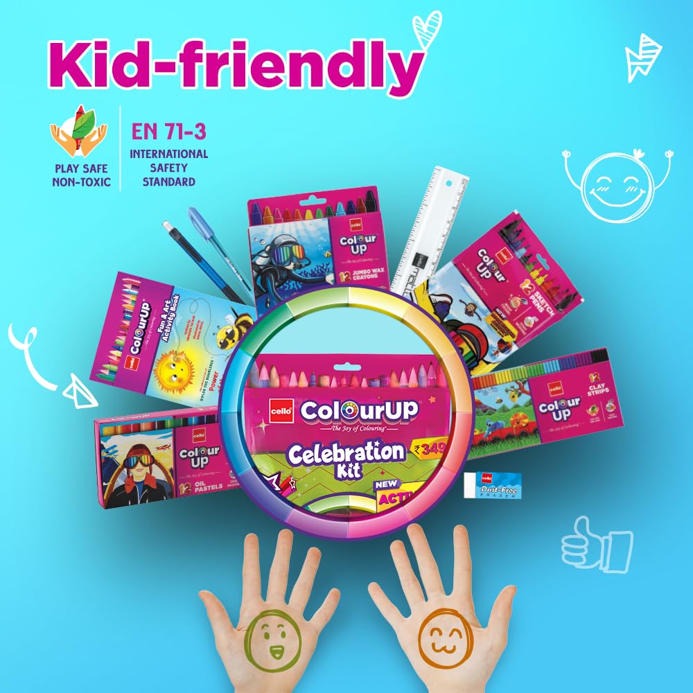 The Cello Celebration Kit – Star Gift Pack includes an assortment of colouring and stationery items essential for kids. This art kit contains 12 Jumbo Wax Crayons, 12 Oil Pastel, 12 Sketch Pens, 12 Clay Stripes, 1 Colour Ball Pen,1 Scale, 1 Eraser,1 Arc Mechanical Pencil, and 1 DIY Story Activity Book. The contents of this colouring set are non-toxic and safe. The Cello colours have a 2x stronger build that makes them last longer. This colouring set has an exciting DIY Story Book for colouring and Learning, making it ideal for gifting to kids.