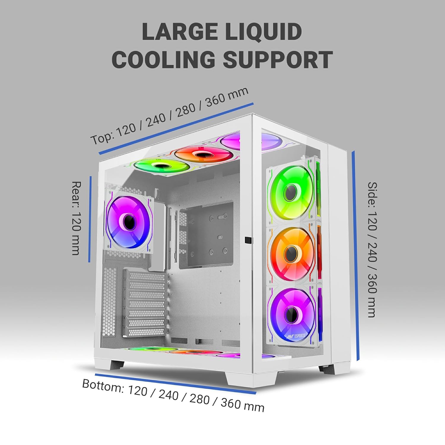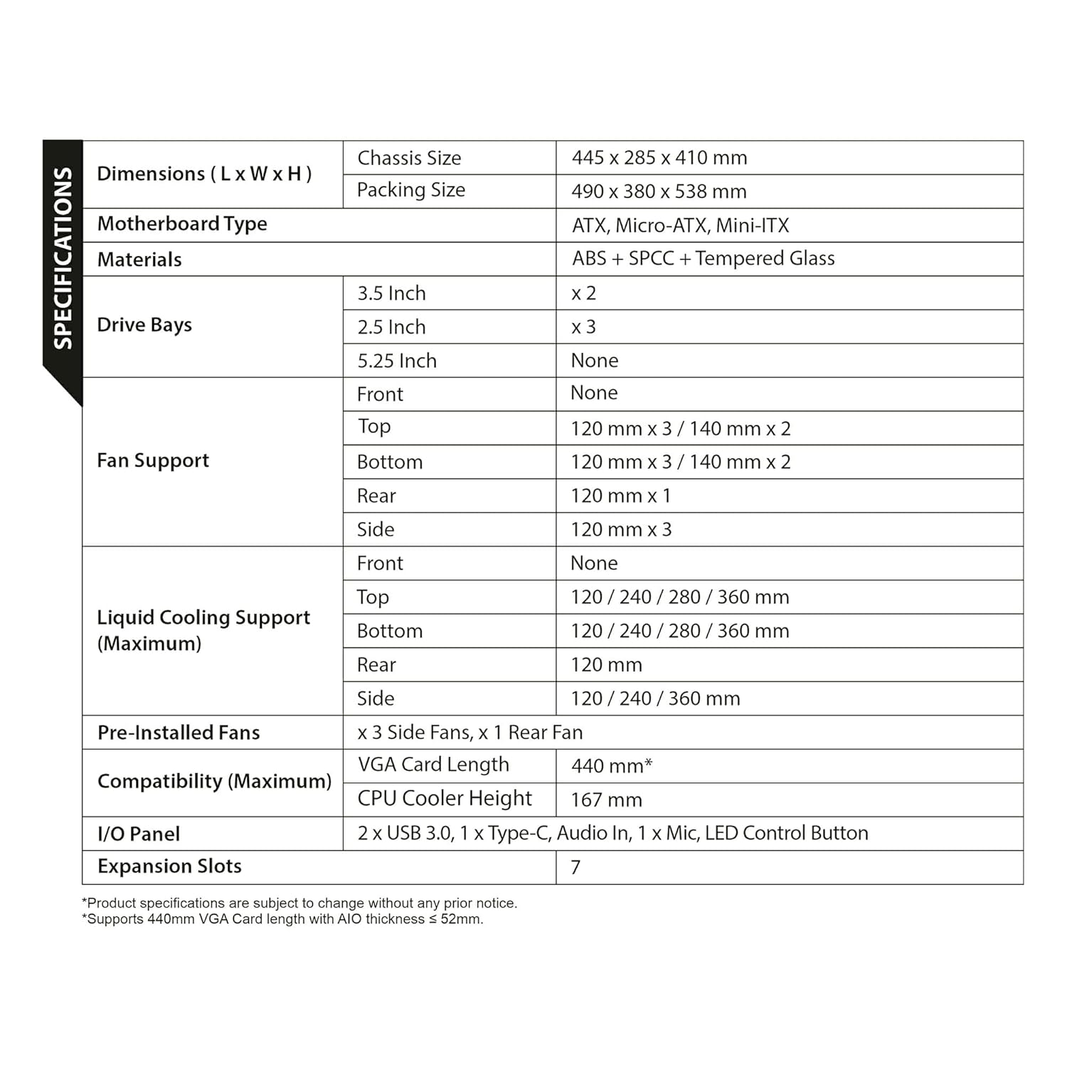 Fan Support : 3 x 120mm / 2 x 140mm Top, 3 x 120mm / 2 x 140mm Botton, 1 x 120mm Rear and 3 x 120mm Side