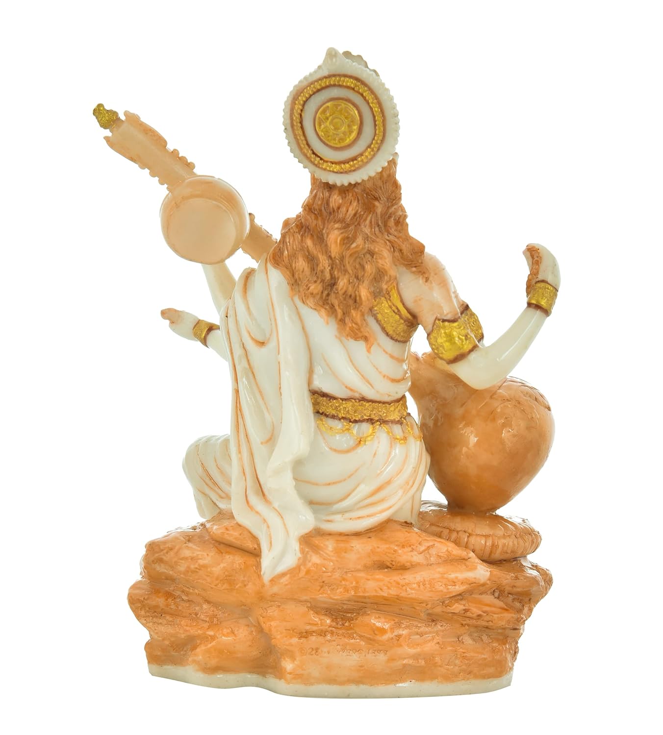Saraswati Ji is typically depicted with a veena (a musical instrument), a book or scroll (symbolizing knowledge), and a swan. Ensure that the idol includes these symbolic elements.