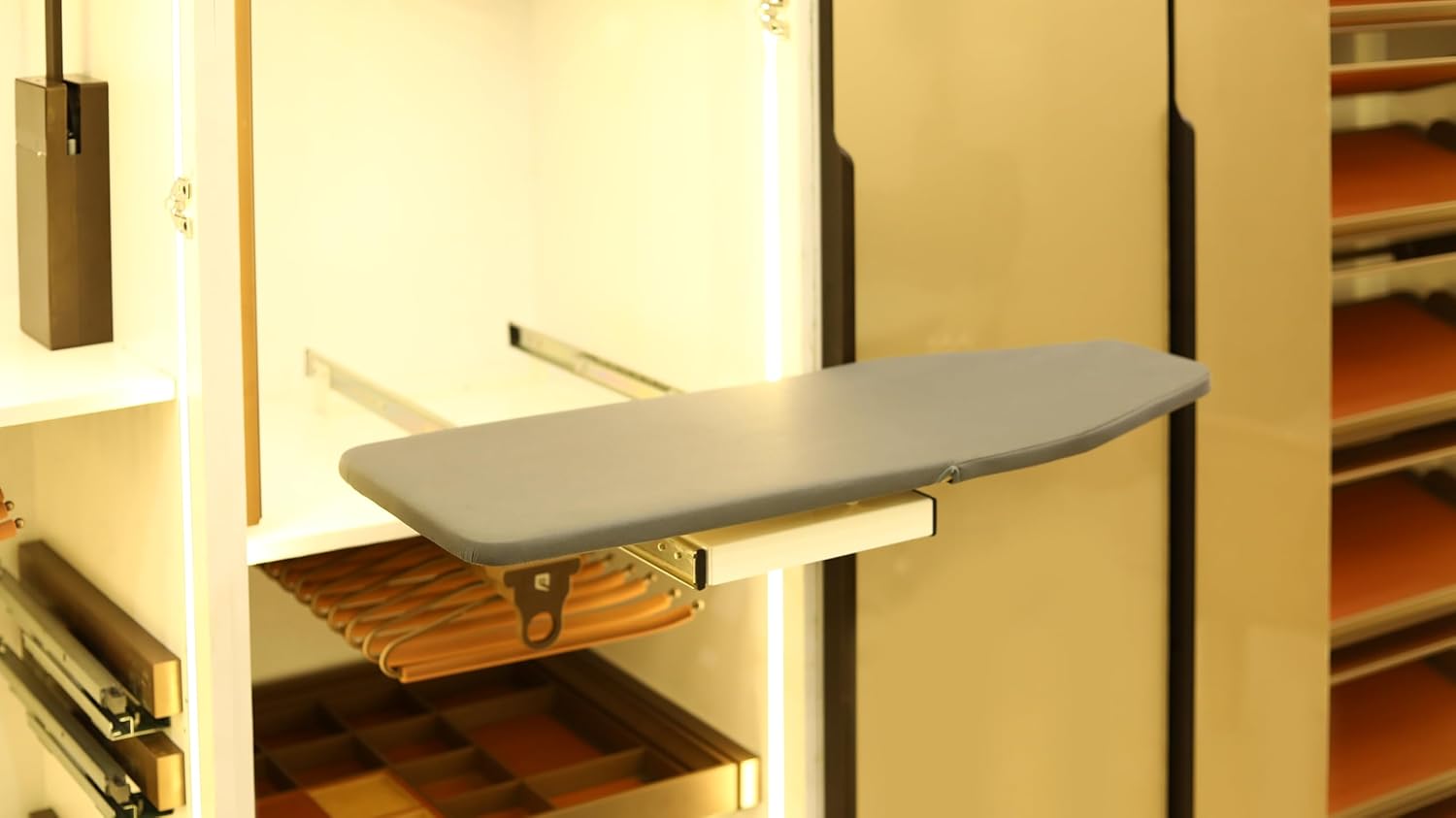Transform your closet organization with this sleek, pull-out ironing board that maximizes space efficiency. The built-in design features a sturdy mounting system that allows for seamless integration into your wardrobe or laundry area. The grey padded surface provides ample space for pressing garments, while the fold-away mechanism ensures it stays hidden when not in use. Perfect for apartments, custom closets, or any space where traditional ironing boards would be cumbersome. The clever sliding mechanism enables smooth deployment and storage, making it an ideal solution for those seeking to optimize their living space without compromising on functionality. The durable construction and professional-grade materials ensure long-lasting performance for all your pressing needs.