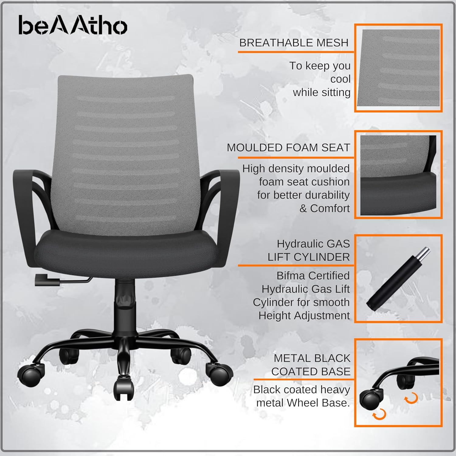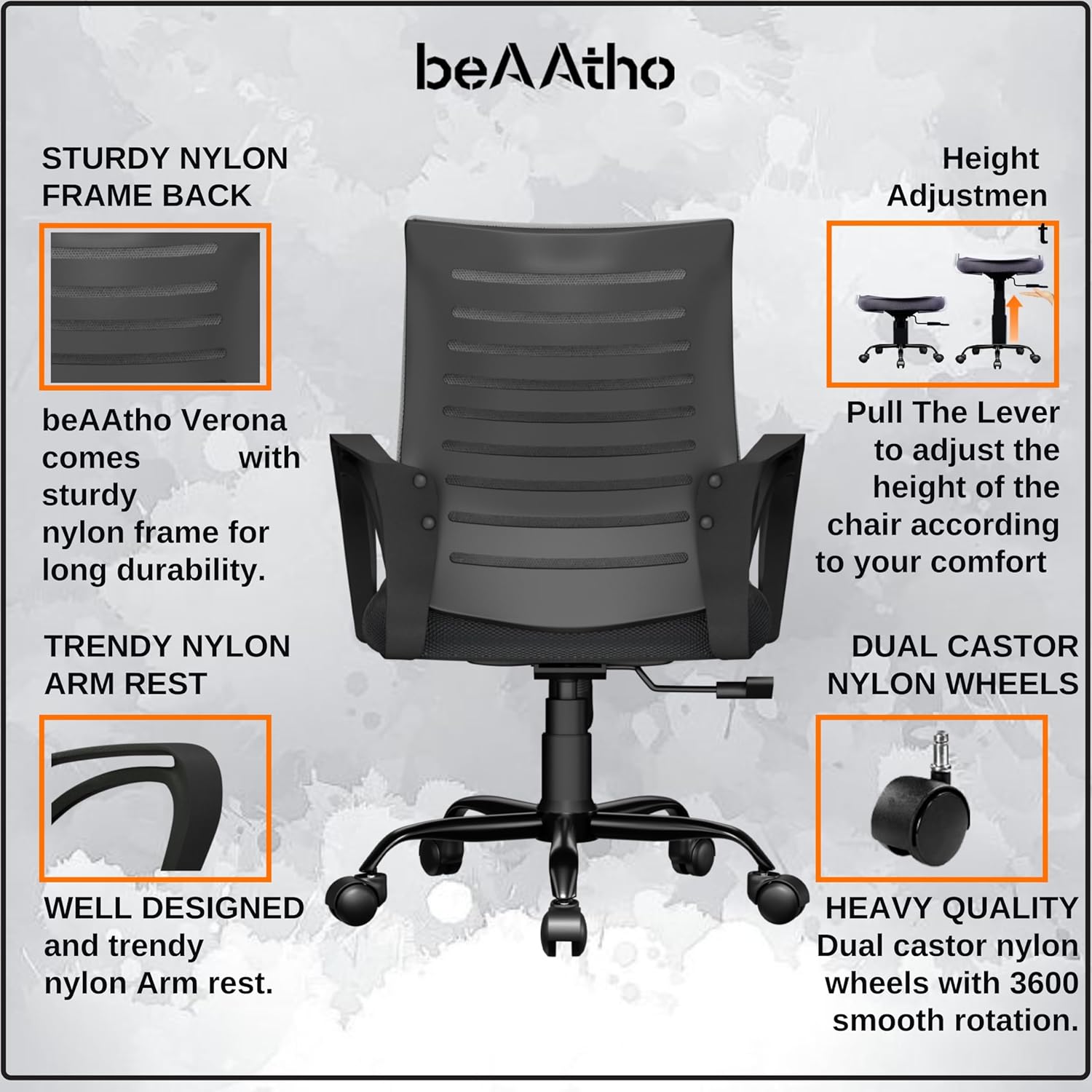 ERGONOMICALLY ADJUSTBALE :- beAAtho VERONA is designed to give you ultimate comfort by providing you fully adjustable chair which has Ergonomic Nylon back support, with breathable mesh to keep you sweat free, adjustable height, Smart Tilting Mechanism with locking feature and Smooth 360 degree Swivel.