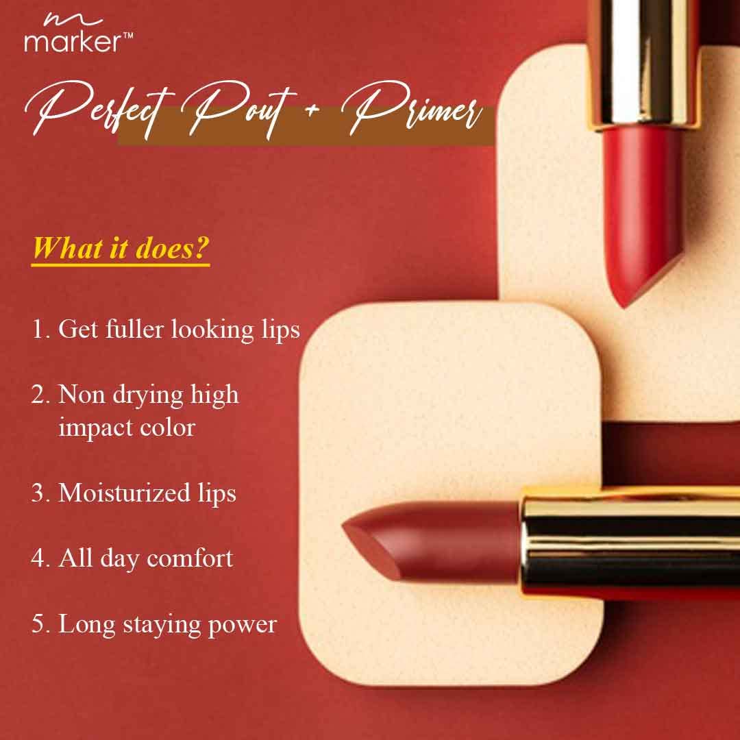 Create, Recreate your Color Obsession. Get fuller-looking lips in one perfect stroke easily. Beauty Relay presents Perfect Pout+Primer Lipsticks. It offers the perfect balance of NON-DRYING high impact color, moisture, all day comfort and staying power together in just one product. Infused with Sunflower Oil, Apricot Oil, Vitamin-C, Vitamin-E, Candelilla Wax & Carnauba Wax, these one stroke lipsticks are available in 18 different shades that deliver luscious, bold color for everyday wear. Get high coverage, full impact color and a flawless matte finish in just one stroke. Sunflower Oil helps skin retain moisture & skin regeneration. Apricot Oil is perfect for moisturizing and nourishing lips. So supremely comfortable and moisturizing, it goes on like a dream. A whole new sensorial experience, you’ll just want to keep applying it. Marker Ultimate Perfect Pout+Primer Lipsticks are good for your lips also. The base delivers one-stroke intensity. Apply the color, starting at the center of the upper lip and moving outward toward one corner. Blot your lips. And you are ready to glow