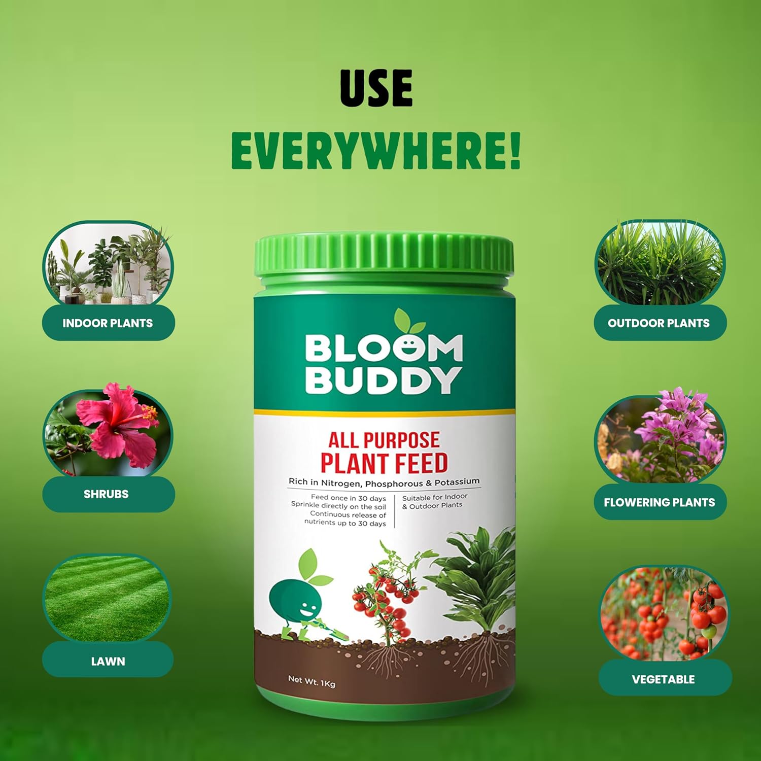 Bloombuddy All Purpose Plant Feed Fertilizer manuere for plants home garden. This versatile fertilizer is designed for all purpose plant feed usage, making it ideal for small, medium, large plants, and even trees.