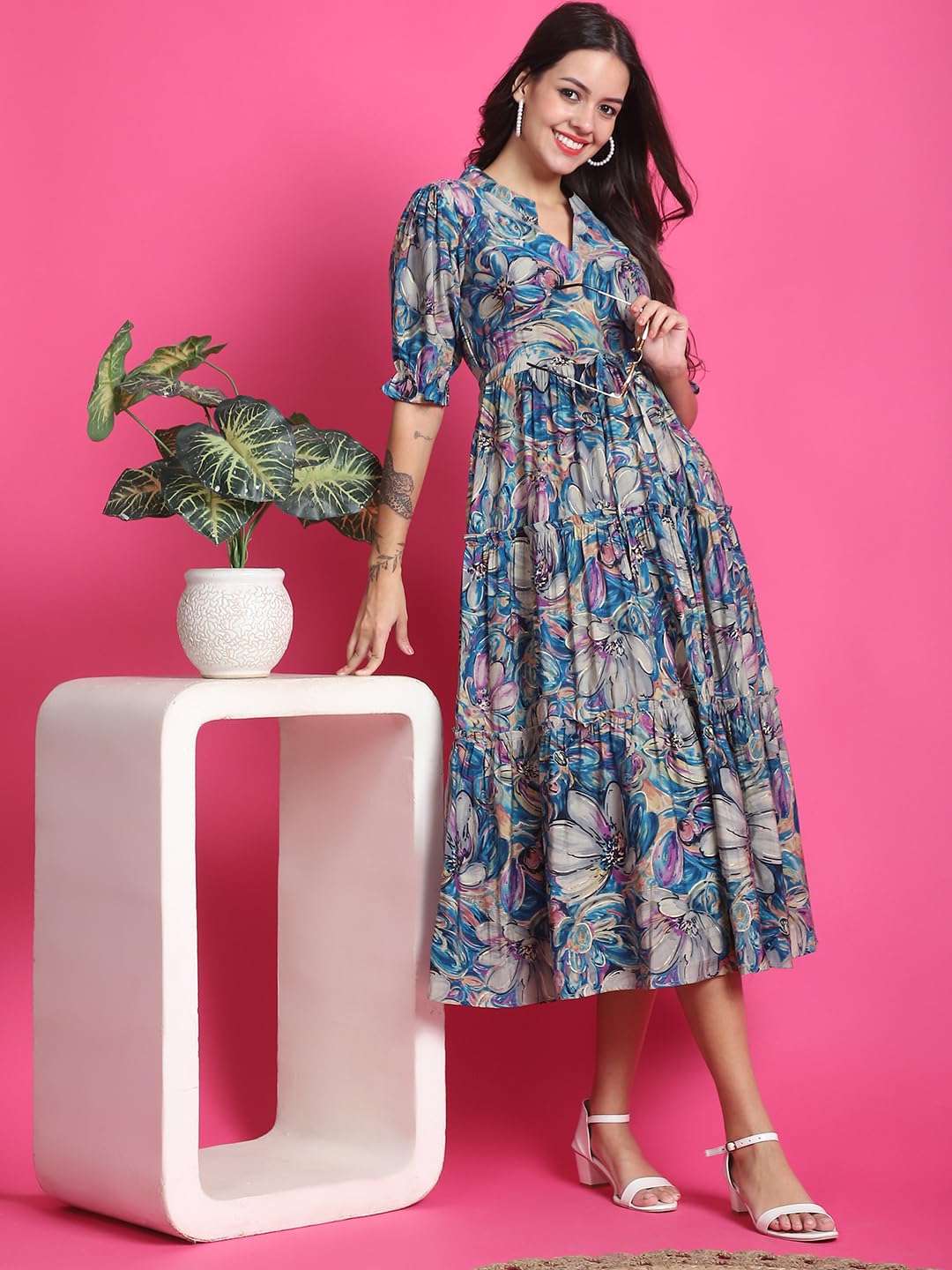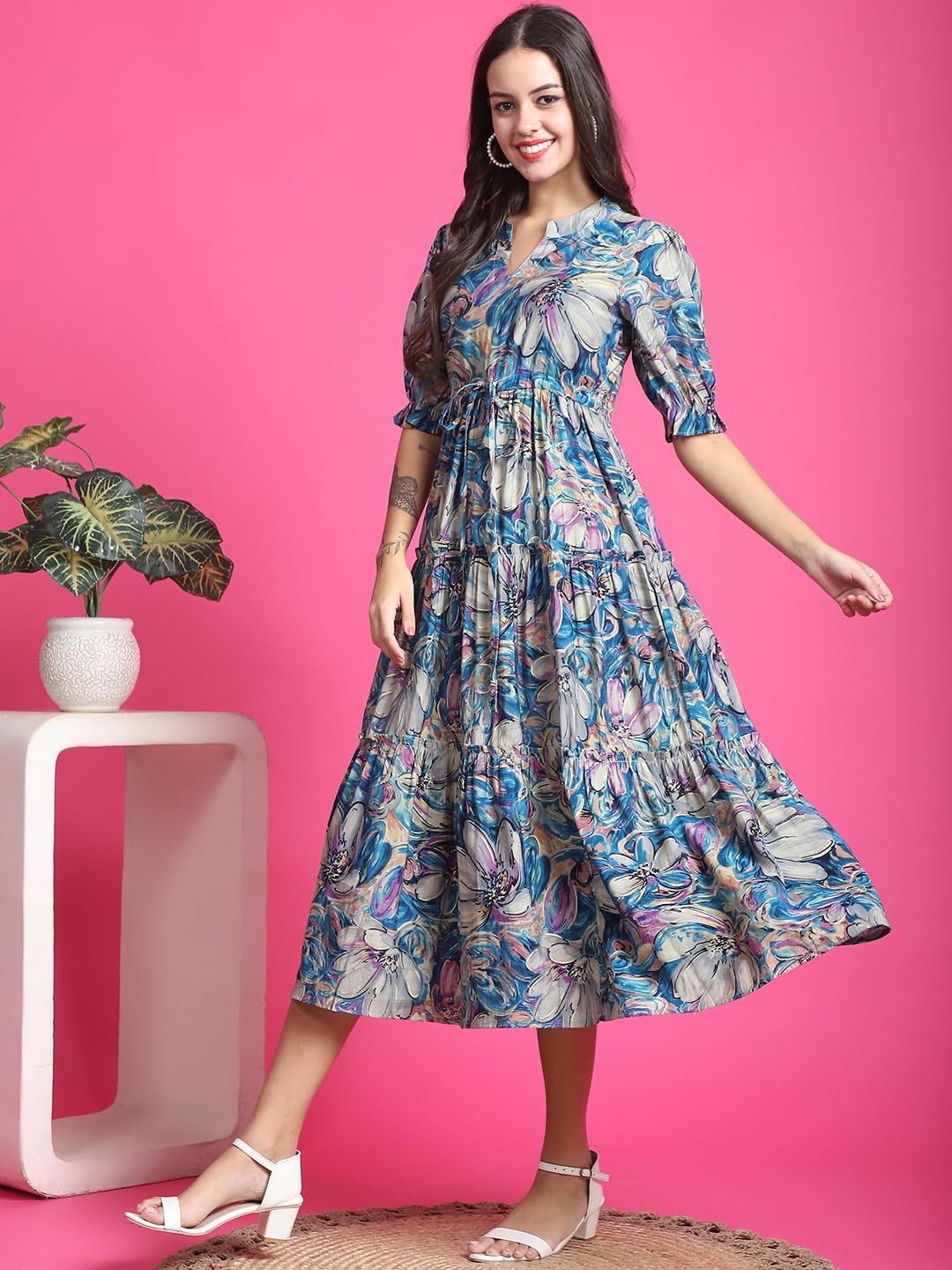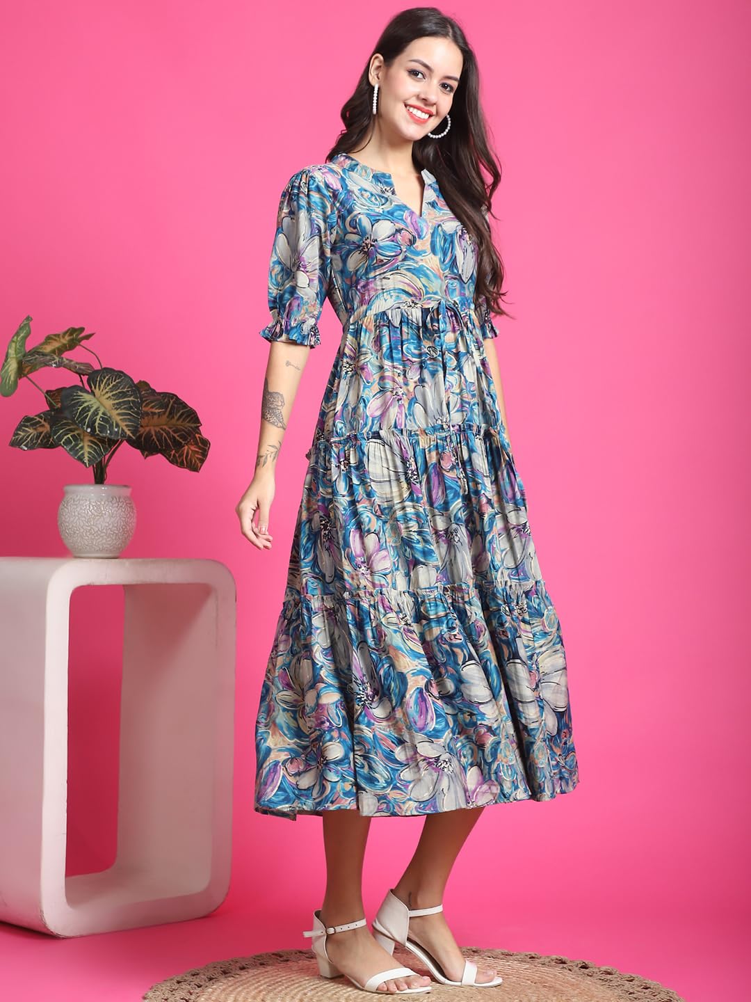 Blue floral printed fit & flare midi dress Mandarin collar Short, puff sleeves Tiered & tie-up detail Midi length in flared hem Cotton cambric fabric