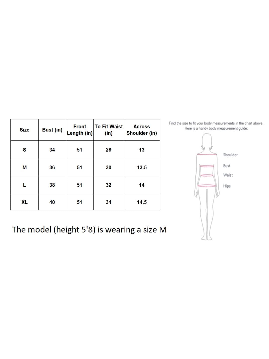 The model (height 5’8) is wearing a size M. To confirm your size before purchase, refer to the Size Chart in the images. Size Chart In Inches – Size : S “Bust 34 Length 51” Size : M “Bust 36 Length 51” Size : L “Bust 38 Length 51” Size : XL “Bust 40 Length 51”