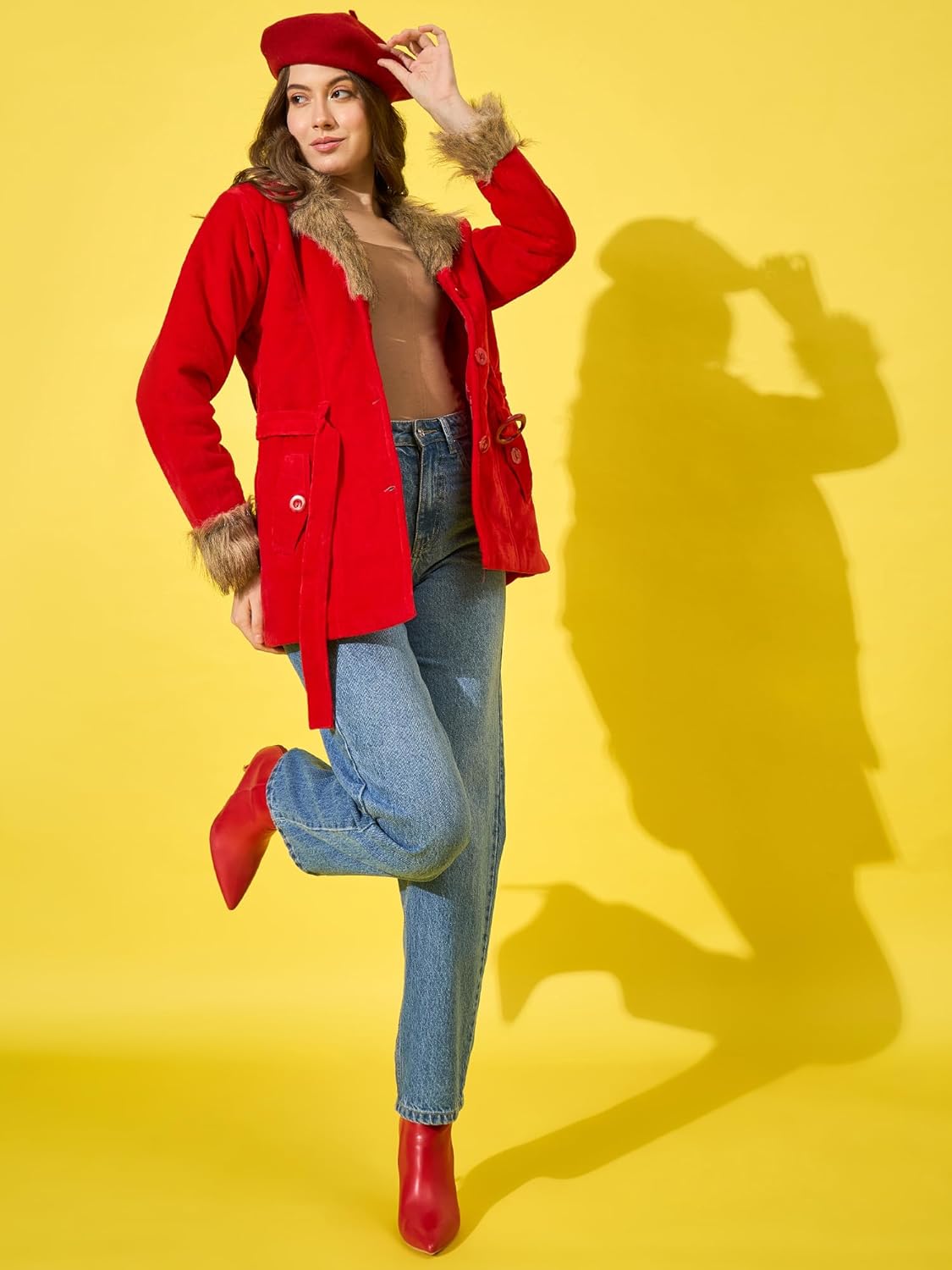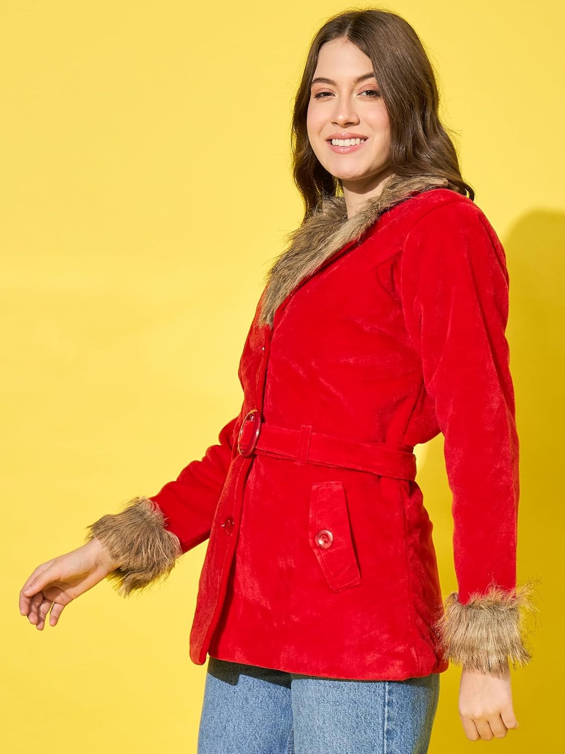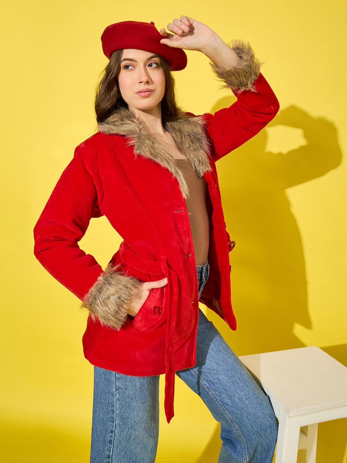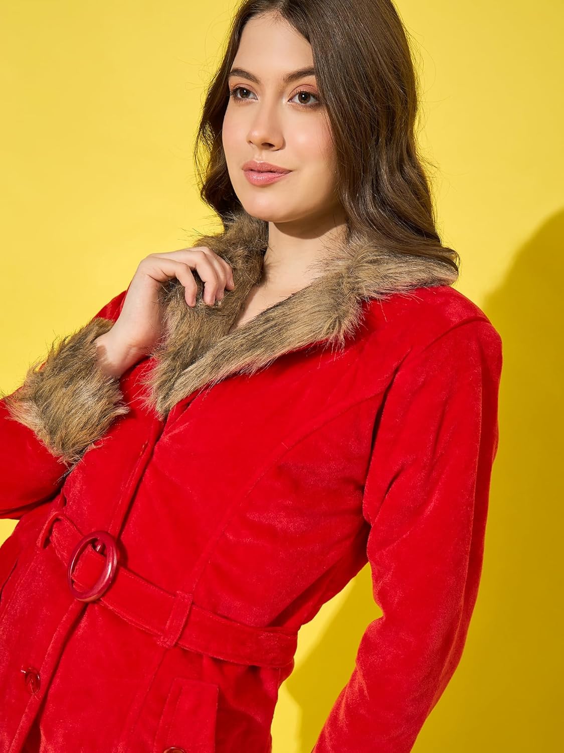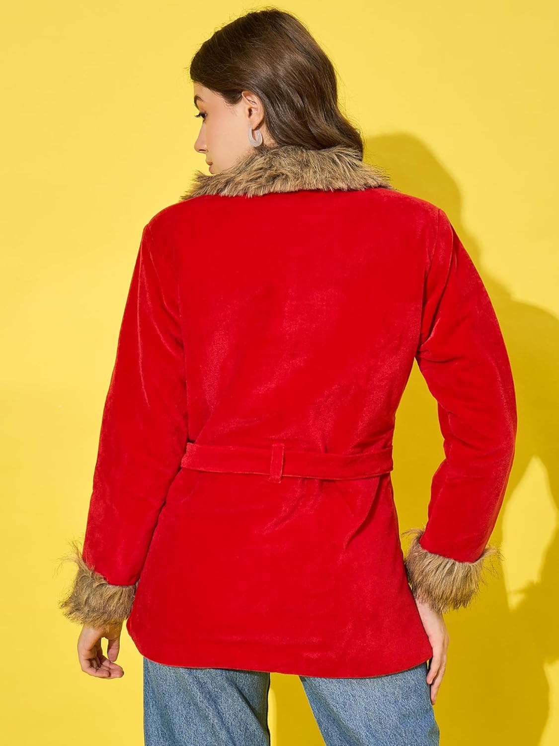 Stay warm in style with this elegant women winter velvet jacket, featuring a plush fur lining for ultimate comfort. Designed with a classic button closure and a flattering belted waist, it offers a tailored fit. Two spacious pockets add practicality, making this luxurious jacket perfect for both casual and formal occasions. The model (height 5’8) is wearing a size M. Size Chart In Inches -Size : S “Bust 38 Length 28” Size : M “Bust 40 Length 29” Size : L “Bust 42 Length 30” Size : XL “Bust 44 Length 31” Size : XXL “Bust 46 Length 32”