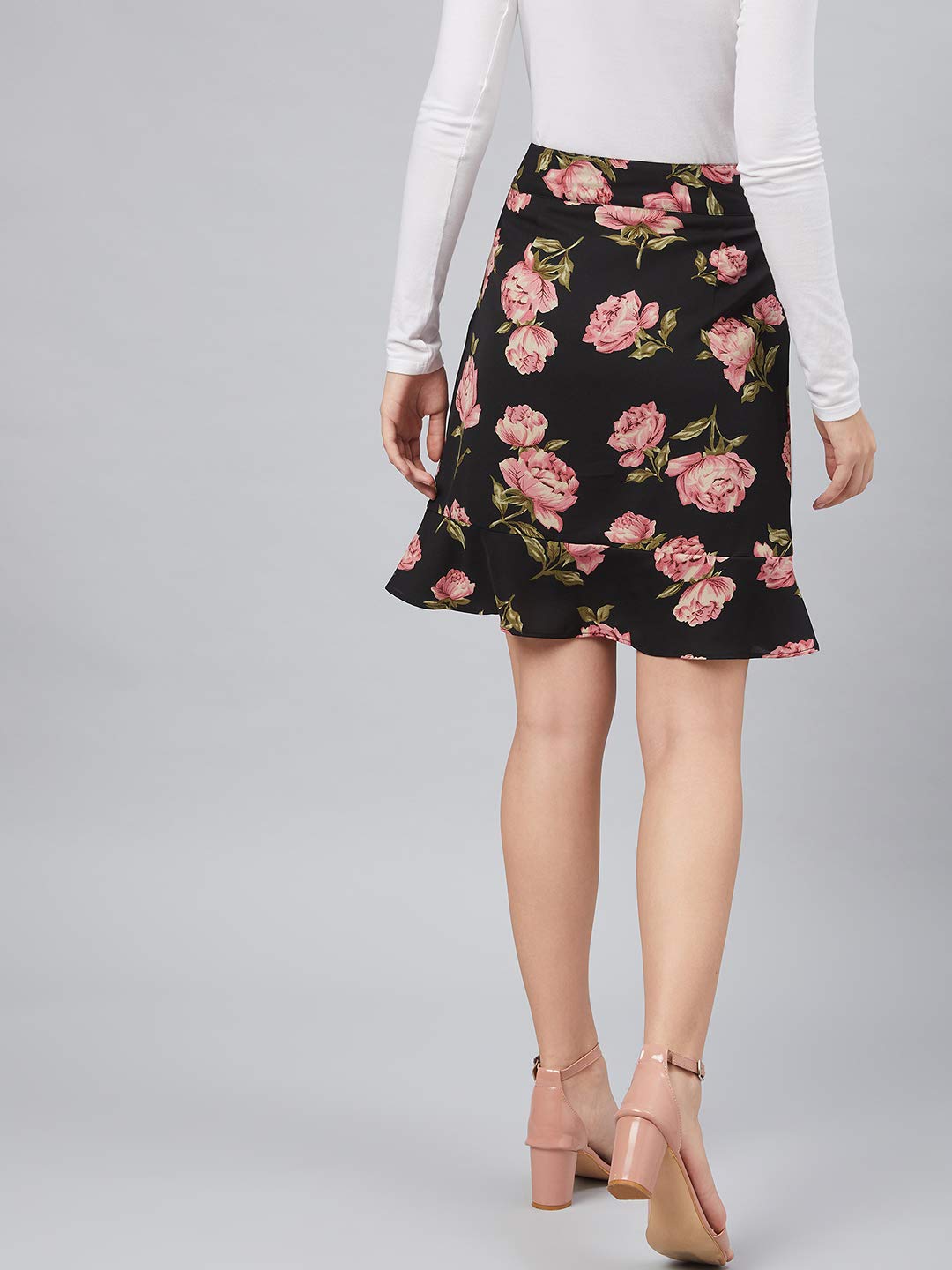 Black, pink and green printed a-line knee-length skirt, has a waistband, zip closure, and straight hem.