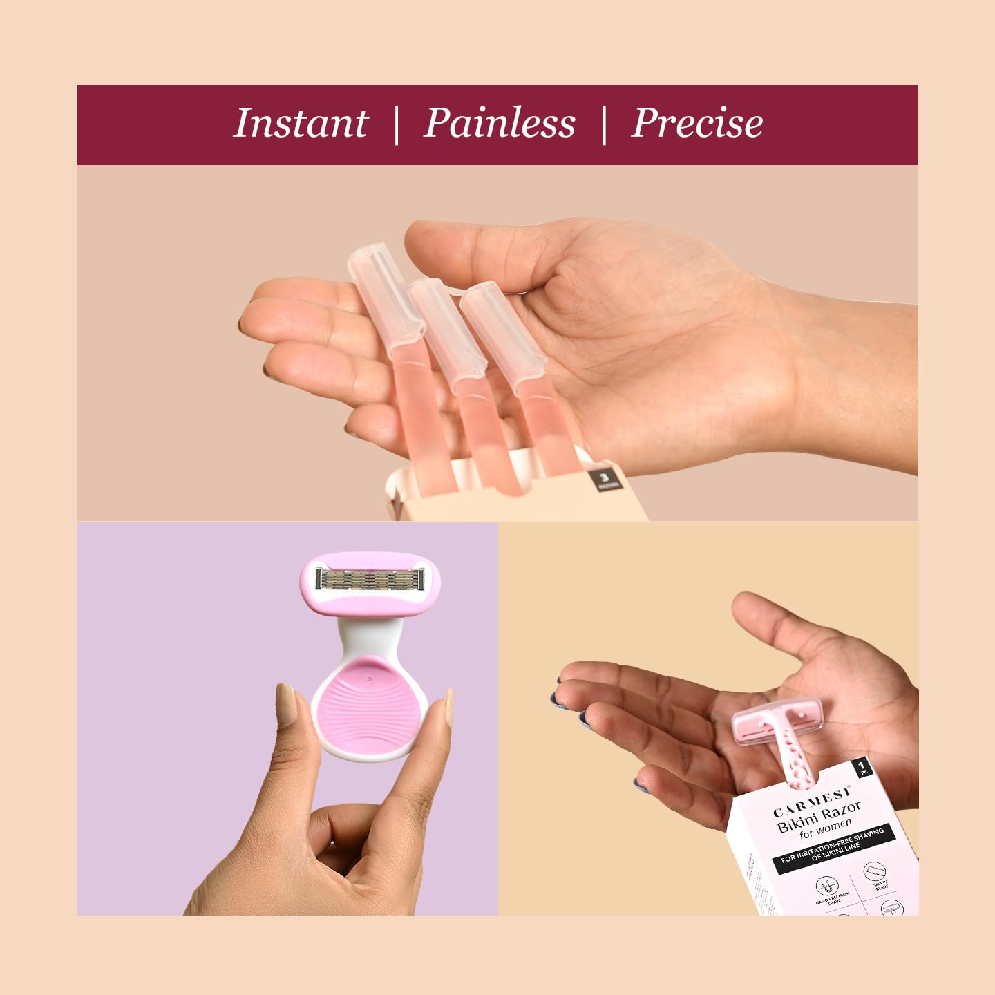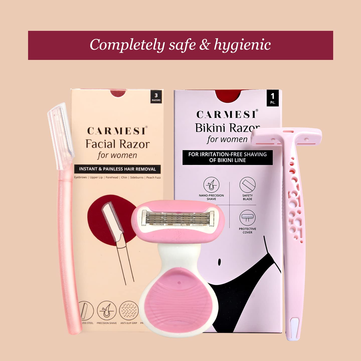 Removing your body or facial hair or leaving it alone is a completely personal choice. But, if you choose to go hairless, opt for an instant & painless experience with the Carmesi Complete Hair Removal Pack! This combo comprises a Facial Razor, a Body Razor, and a Bikini Razor. Use these to remove hair from your face, arms, legs, underarms, and bikini line. All the razors are super easy to use, and come with a tonne of benefits. For instance, while the Facial Razor not only helps remove hair from all over your face, but also leaves your skin super smooth. It also enables better penetration of skincare products, and makes make-up application a lot smoother. The Body Razor, on the other hand, is enriched with Aloe Vera & Vitamin E, for a super smooth shave. It’s also travel-friendly, meaning that it easily fits in your pocket, purse, or handbag. As for the Bikini Razor, the ergonomic handle and the safety comb allows you to shave down there with no difficulty at all. All three razor blades are also safe to use & completely hygienic.