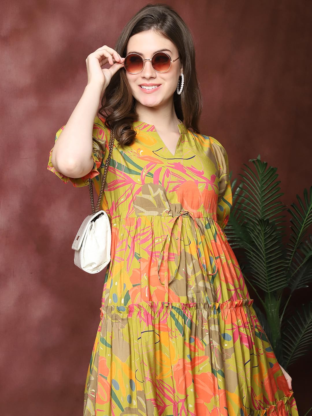 Mustard yellow floral print maxi dress Mandarin collar Short, regular sleeves Midi length in flared hem