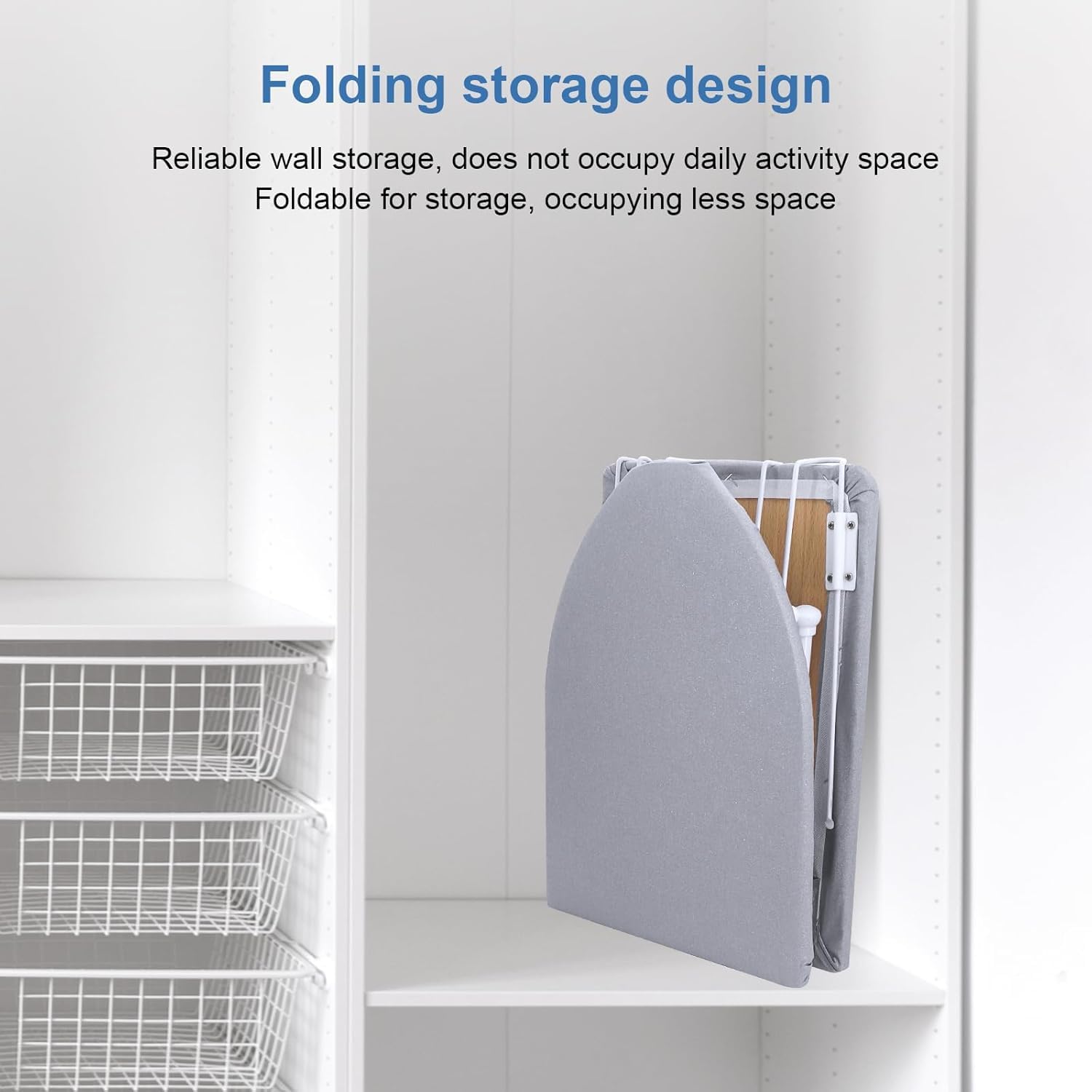 The ironing board can be folded with a damped hinge to save space.