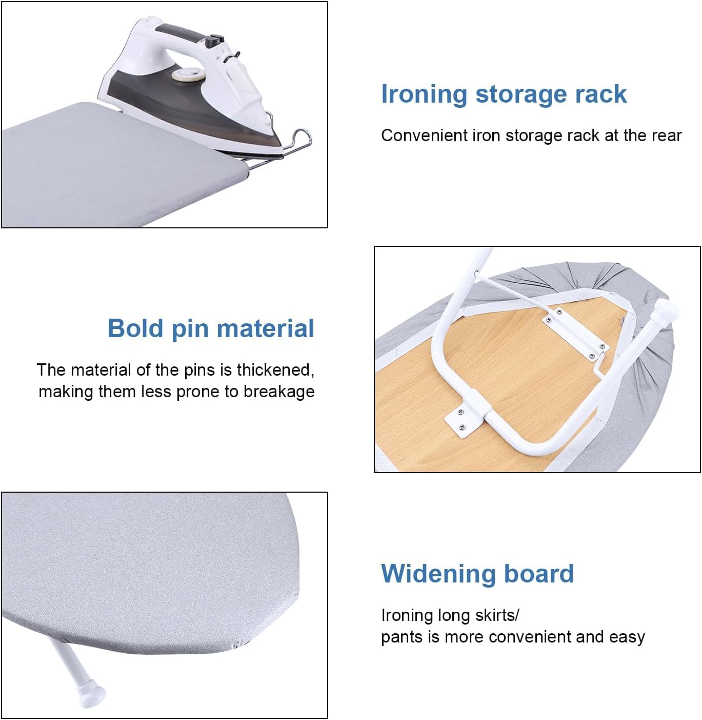 Easy Storage: When folded, the folding ironing board with locking button and small hooks for hanging on walls and doors or storing in narrow closets and drawers, easy to store.