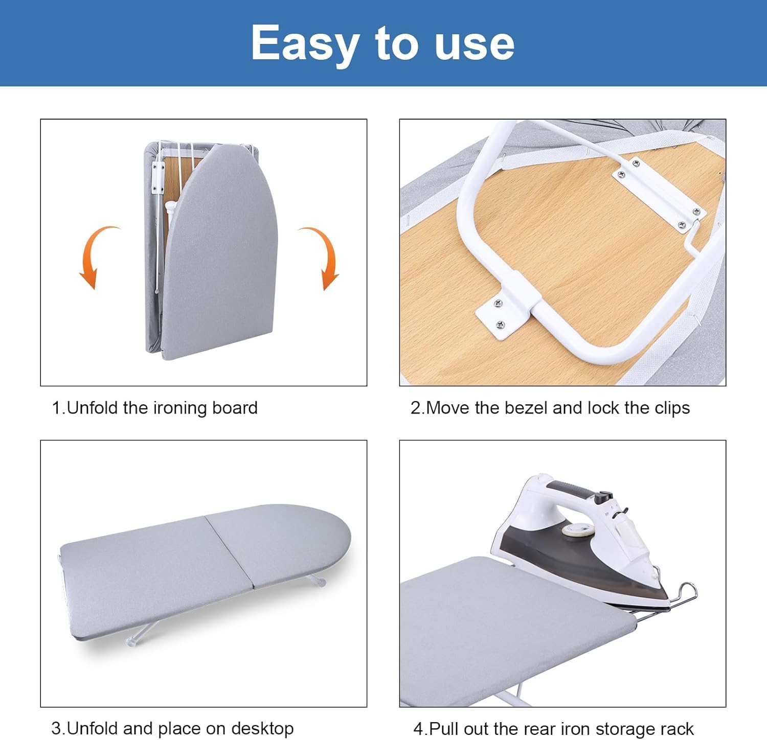 Sturdy frame & Anti Slip: The folding steel legs are sturdy and durable. With TPR foot cover on the legs, the tabletop ironing board is always kept in place. You can rotate the cap and adjust the legs to keep the iron board stable enough.