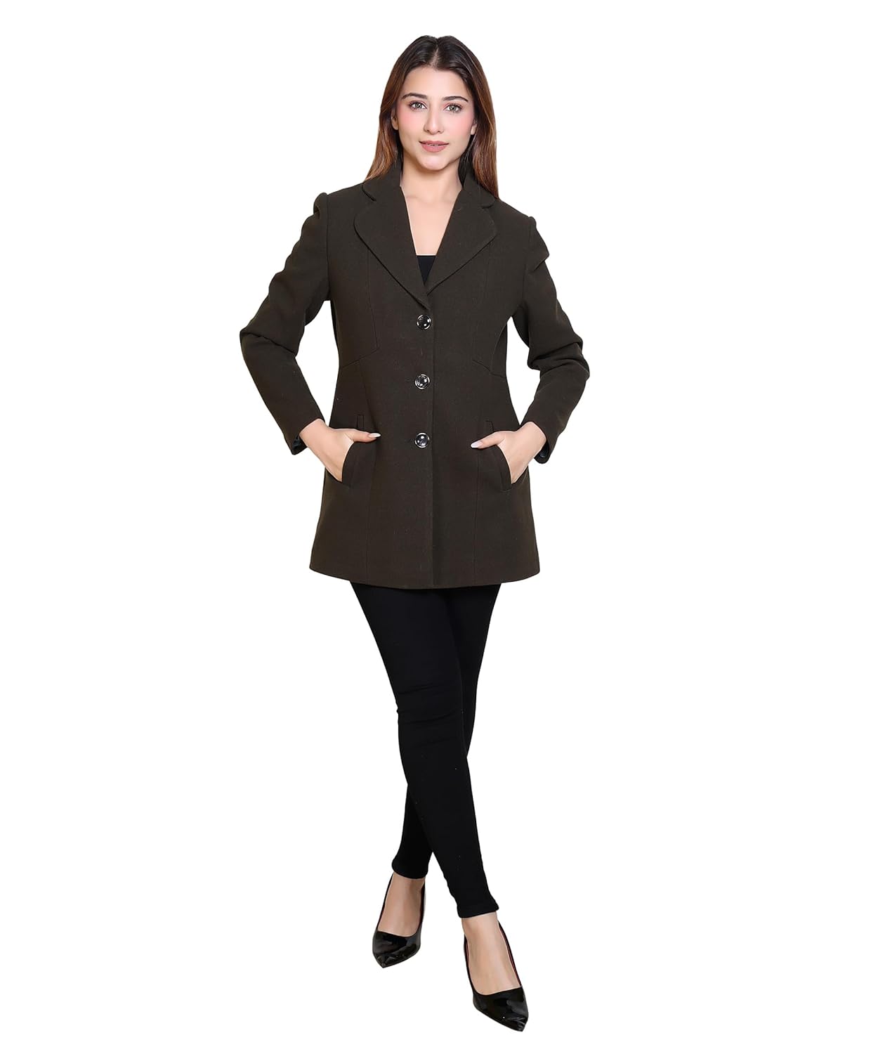 Comfy Sparrow Women Notch Lapel Collar Traditional Coat With Three Buttons, Two concealed pockets & one inner pocket. Feel the warmth in the chilly winter & lend in style with this woolen coat from the house of comfy sparrow. This beautiful piece can belayered over any casual to formal attire while going out.