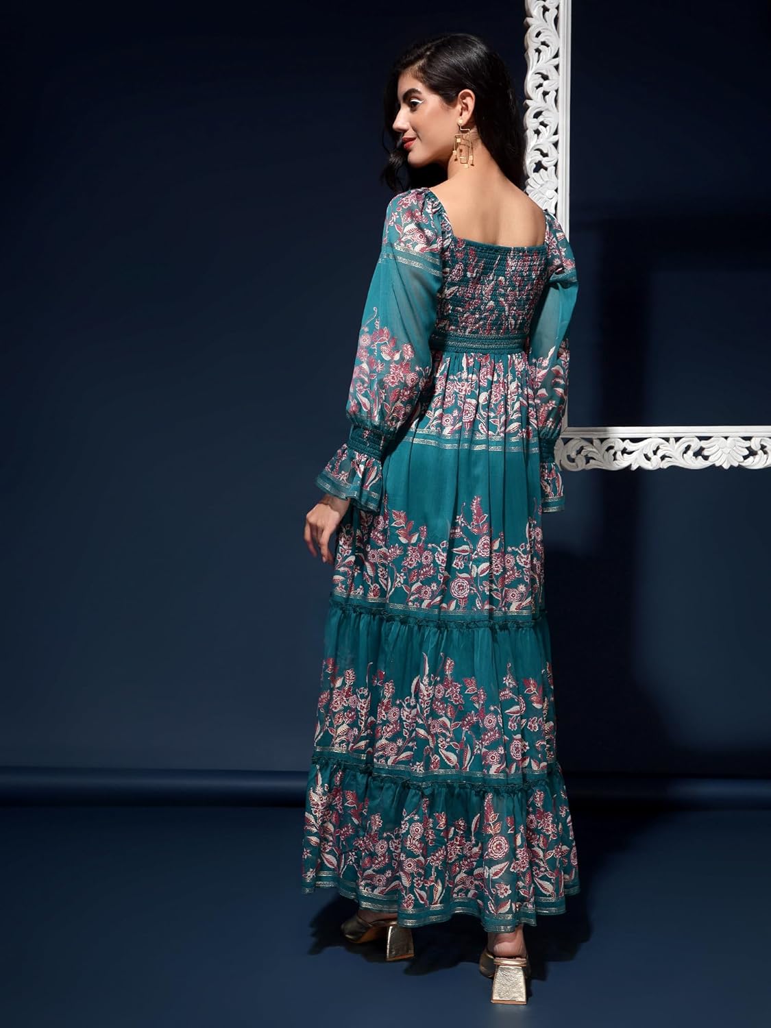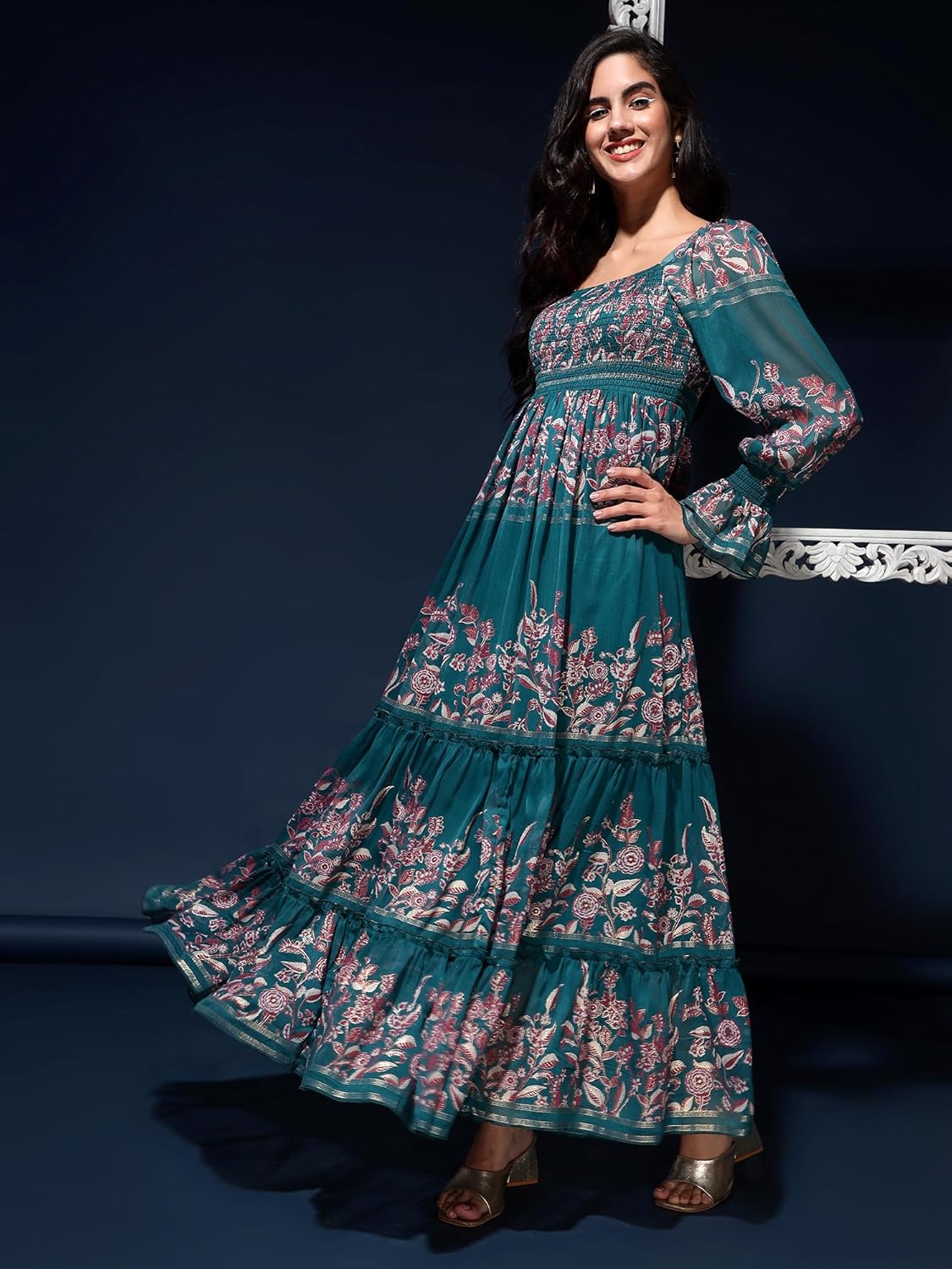 DRAPE AND DAZZLE Presenting Printed Smocked Tier Dress With Sleeve These Fabric Is Chiffon 100% Polyester. These trendy dresses are a pure stunner and makes an everlasting statement whenever you wear it. This gives you flawless shape and flows with the body all day long. A pair of nice pumps and chandelier earrings will complete this gorgeous look! adorned with a contemporary style, this dress showcases more feminine effect. While the refined color scheme makes it visually appealing. Designed to excellence, it will surely complement your curvaceous figure. Make your date special as you flaunt your beauty in this dress. Slip into this ,designer trendy , latest and attractive Striped/ Floral print comfortable long mexi dress from DRAPE AND DAZZLE and look stylish effortlessly. Made for any body type, it will give you that extra confidence and make you stand out wherever you are. Keep the accessories minimal for that added elegant look, just your favorite heels and dangling earrings, and of course, dont forget your pretty smile.Garment is made of Chiffon 100% Polyester, and Has a U designer Neck ,Full Sleeve, can wear at party as well as casual , festival and other occasions.The dress looks pretty good and exactly the same as in the picture.