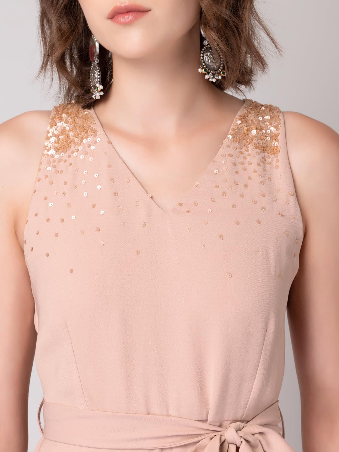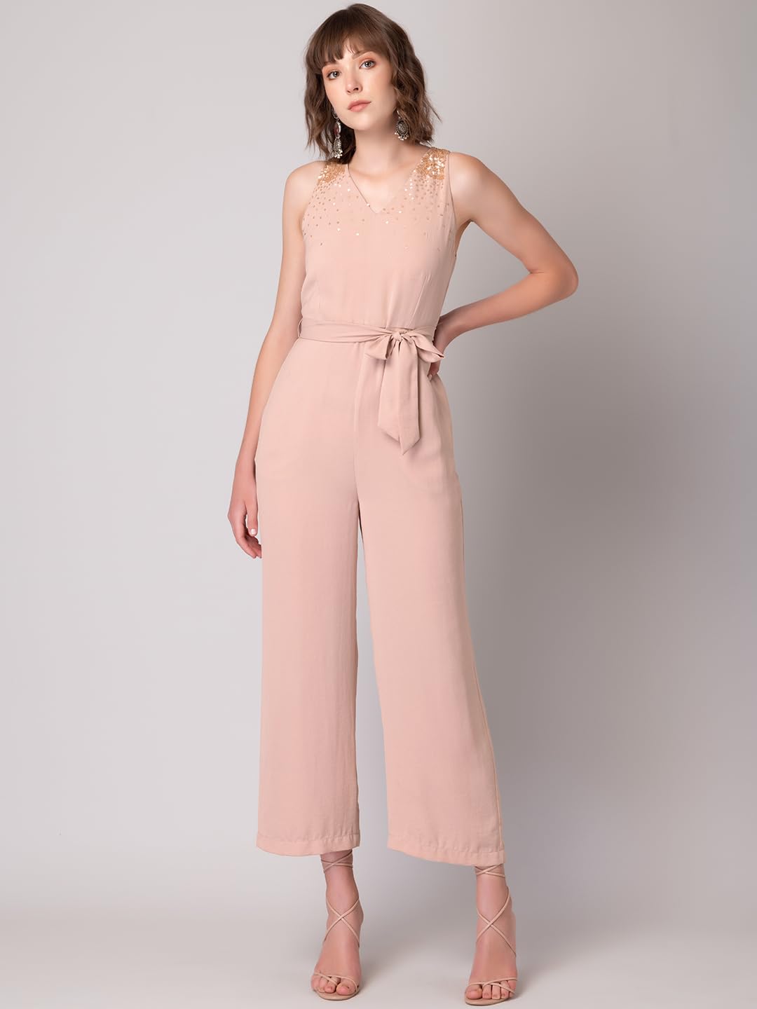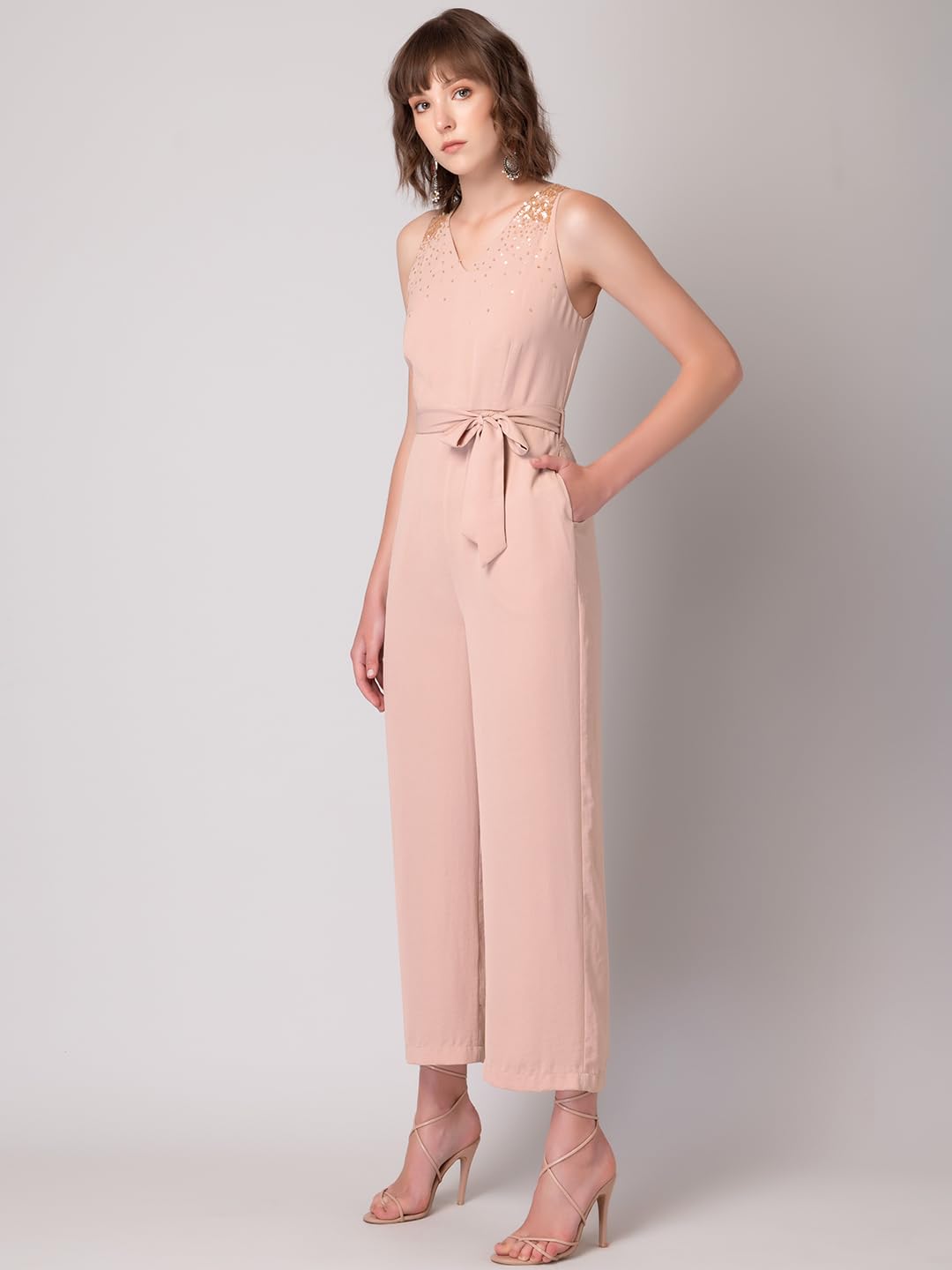 Black jumpsuit in crepe. Tailored sleeveless with a V-neck, it features sequin embellishments around the neck. Finished with a zip closure. It comes with a self fabric belt.