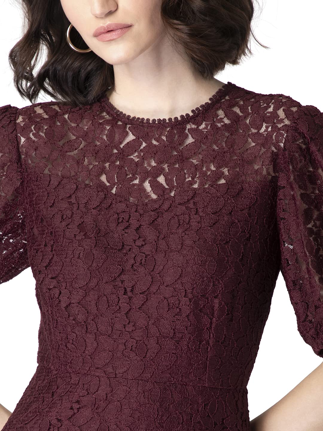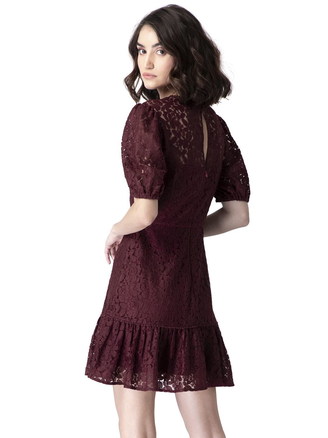 Generic Name : Wine Ruffled Floral Lace Shift Dress
