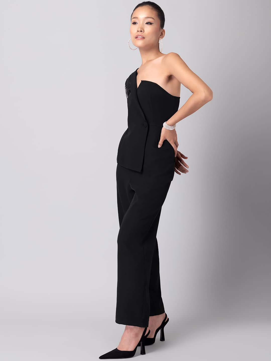 Black jumpsuit in poly lycra. Tailored with a one shoulder design and a full sleeve with embellished details Features two pockets, and a zip closure at the back.