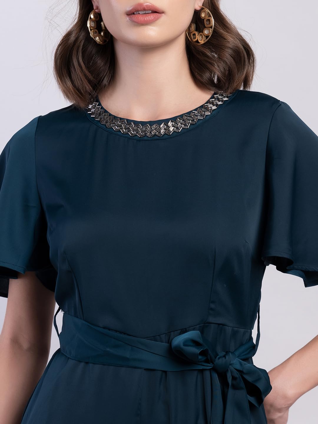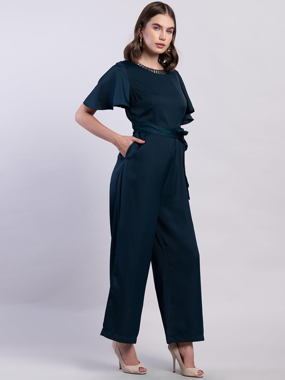 Green Embellished Neck Flared Sleeve Jumpsuit With Belt