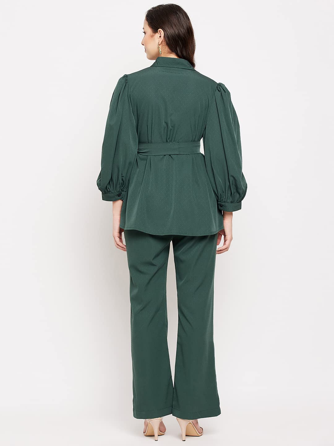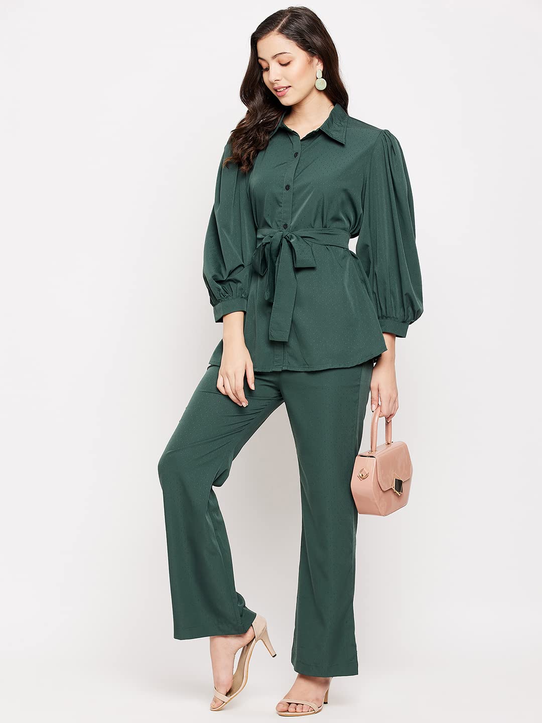 Green solid crepe tie-up shirt with belt & back elasticated waist pant by FashFun. This co-ord set will be good for outing. Very comfortable to wear in both hot or cold weather. Create a casual party look by pairing this co-ord with heels or flats & clutch.