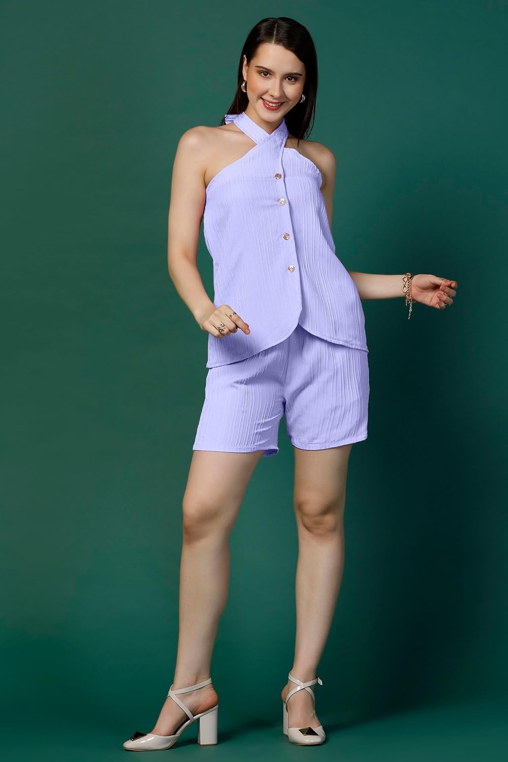 Refresh your wardrobe with this Pista colored co-ord set from Fashion Dream available on Amazon. This halter neck tie on style top and shorts set completes your look for your outing. Get the perfect blend of elegance and comfort with our Women’s Pista Solid Top and Pant Set. This Pista top set for women is made from cotton blend fabric that is light and comfortable to wear, featuring a beautiful solid pattern. This women’s top features a halter neck tie on, sleeveless bodice, front button down placket and elastic fitting at the back, rounded hemline. The top of this set comes with short pant bottom, pockets on both sides and a fully elasticated waistband for a comfortable fit.Pair it with matching sandals to complete a casual yet fashionable look.