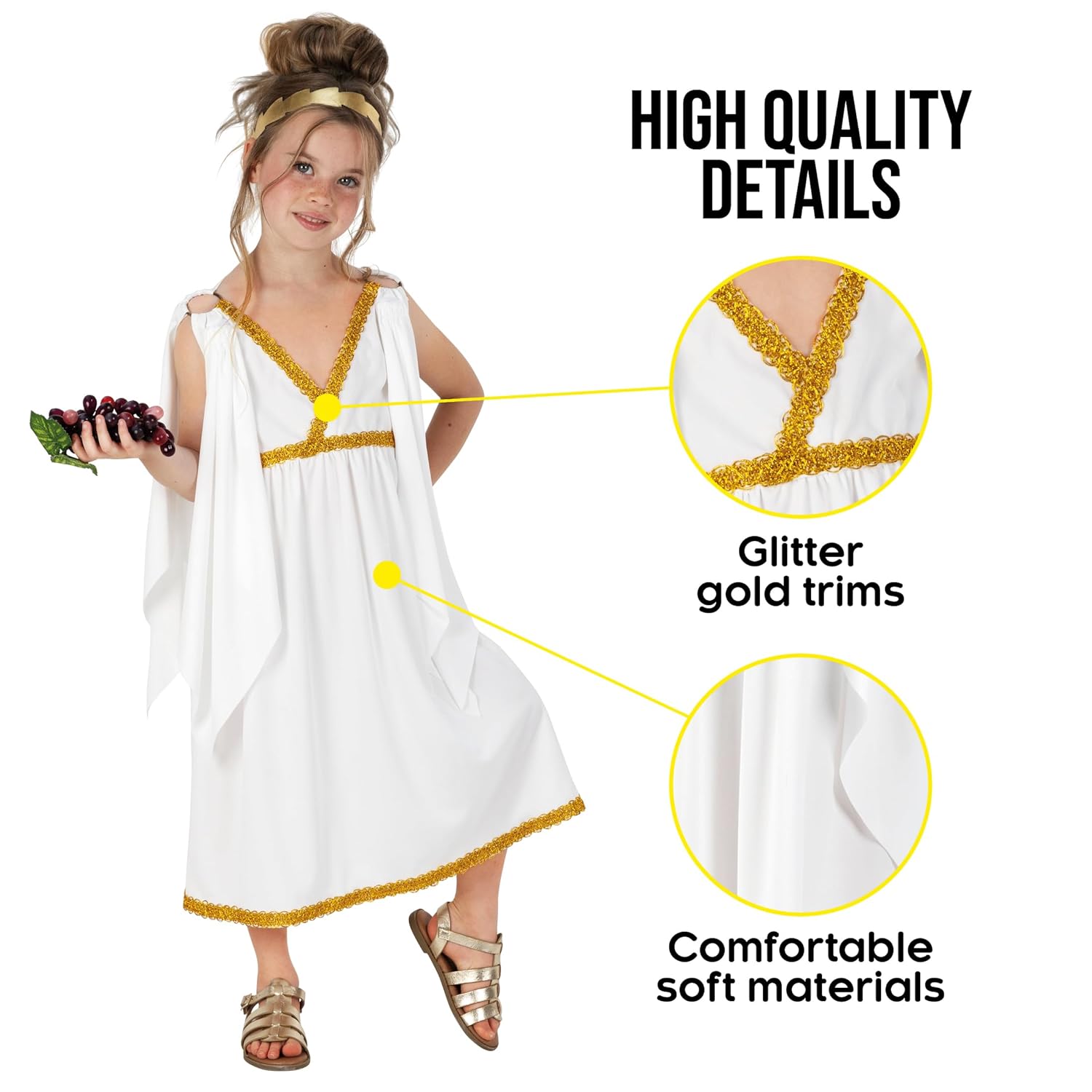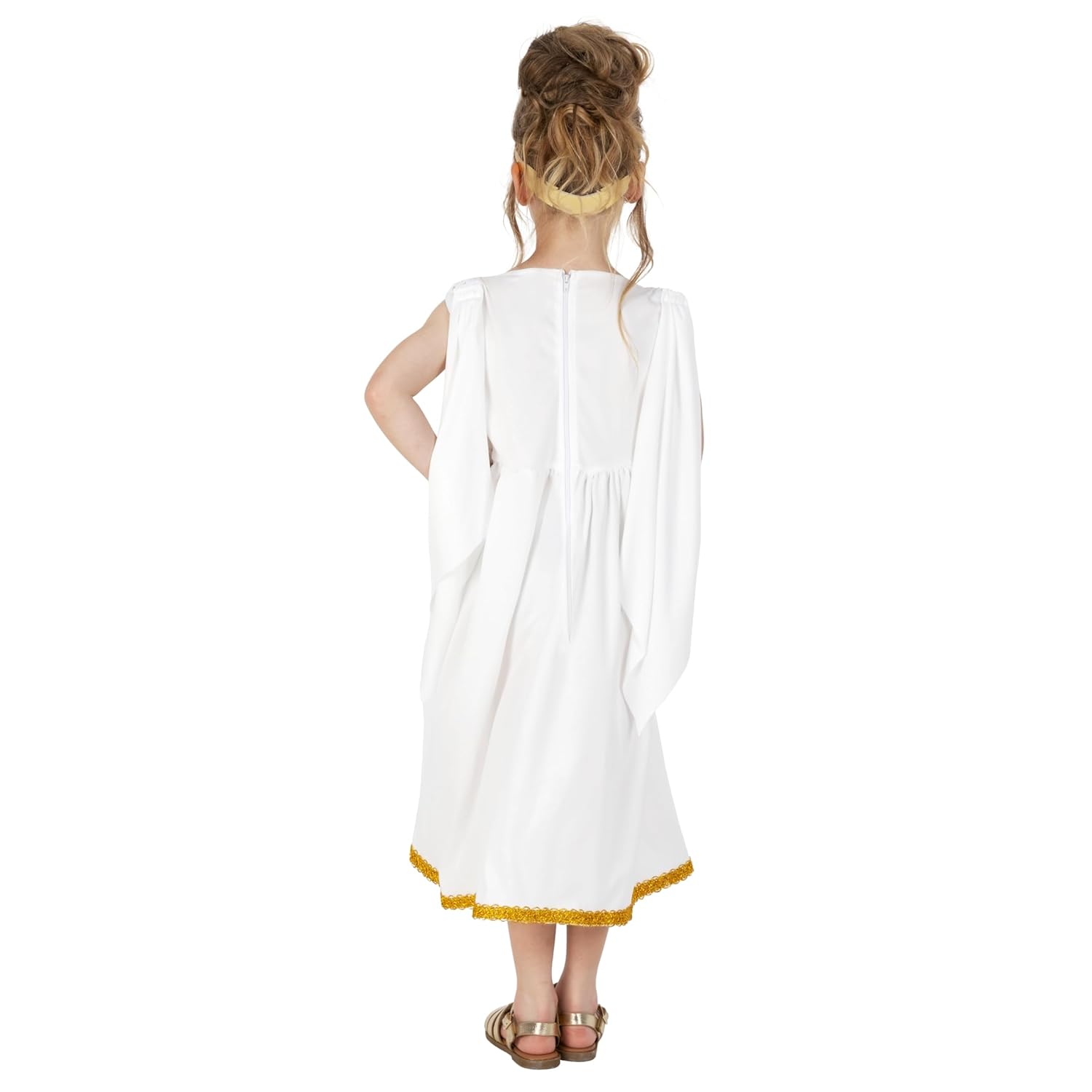 Greek goddess girls costume includes white draped dress with gold detail, a gold crown headband. Available in sizes Small (4-6 Years), Medium (7-9 Years), Large (10-12 Years), X-Large (12-14 years). Please refer to size chart image for further size details. High quality material complete with gold lace details. Comfortable for a variety of body types. Founded in 2009 by 3 friends with a passion for costumes, we now have 100s of designs all manufactured to high standards of quality, fit and design. We have offices in the US, UK and Europe. Perfect greek goddess costume kids, greek goddess kids costume, kids goddess costume, child greek goddess costume, kids goddess costume girls, girls roman costume, greek mythology costumes for kids, kids greek costume, roman girl costume for kids, roman goddess costume girls, toga kids costume, girls greek goddess costume, roman costume girls, girl greek goddess costume, athena girls costume, aphrodite costume kids, girls greek costume, girls goddess halloween costume.