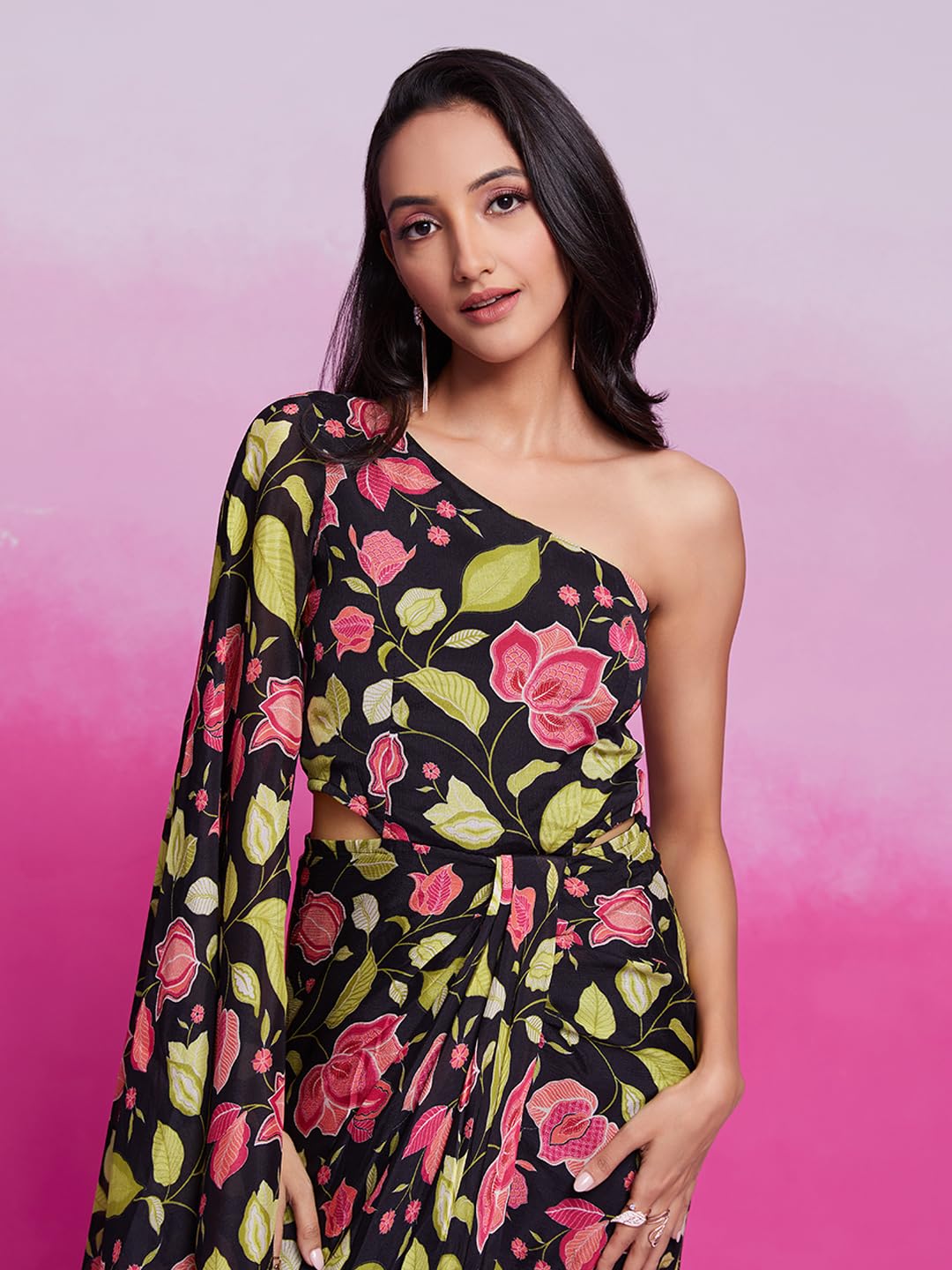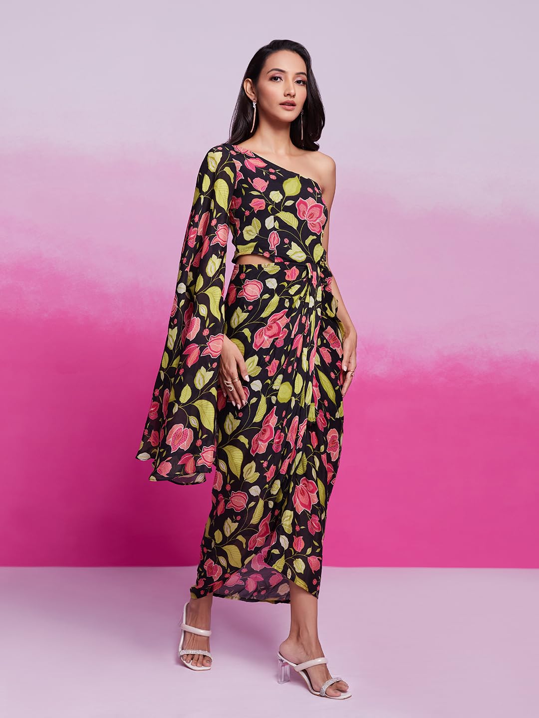 This striking one-shoulder draped dress features a black base adorned with vibrant pink and green floral prints. The asymmetrical design and flowing sleeve create a dramatic and elegant silhouette.