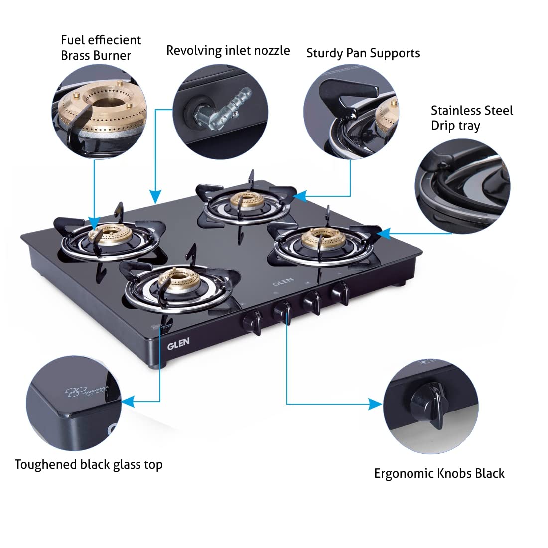 Brass Burners: Equipped with 4 high-efficiency brass burners (2 big and 2 small), the Glen gas stove ensures fast cooking and fuel savings. The brass burners are designed for even heat distribution, allowing you to cook food evenly.