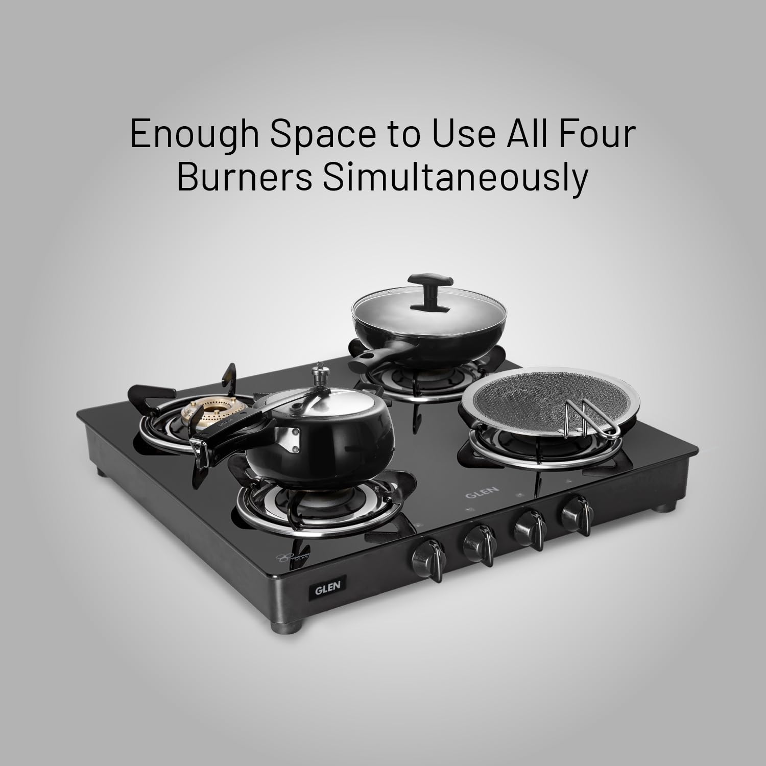 𝗕𝗿𝗮𝘀𝘀 𝗕𝘂𝗿𝗻𝗲𝗿𝘀: Equipped with 4 high-efficiency brass burners (2 big and 2 small), the Glen gas stove ensures fast cooking and fuel savings. The brass burners are designed for even heat distribution, allowing you to cook food evenly.