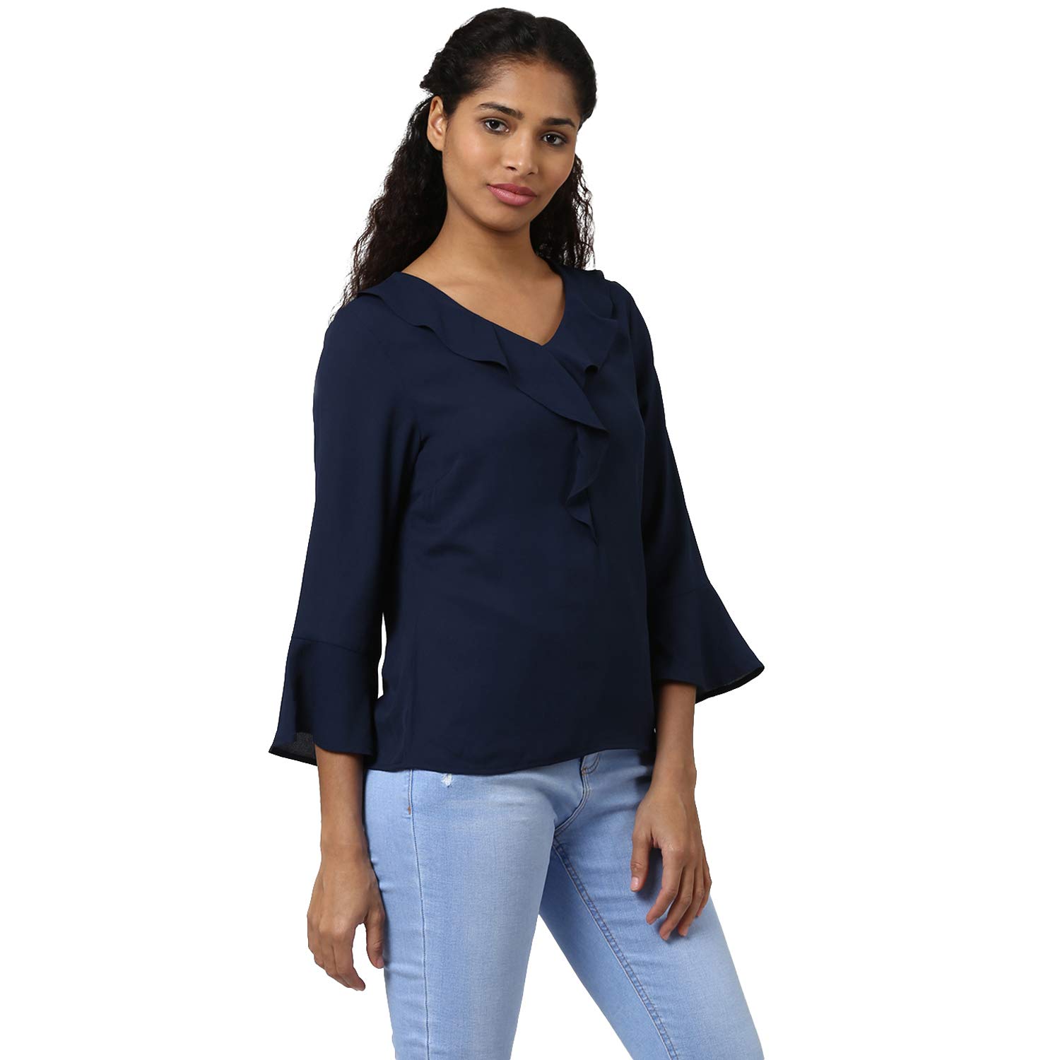 Navy solid woven regular top, has a V-neck, long sleeves