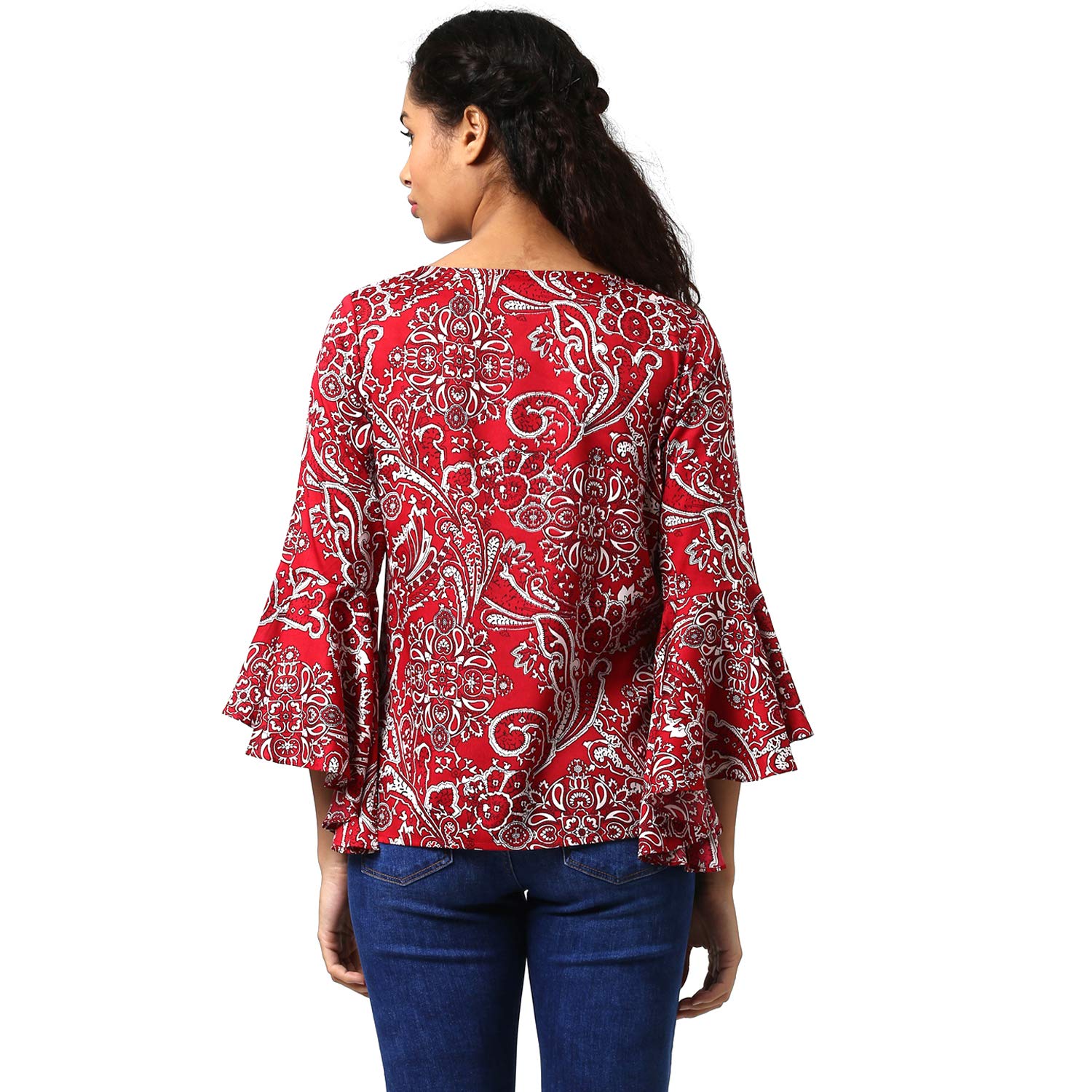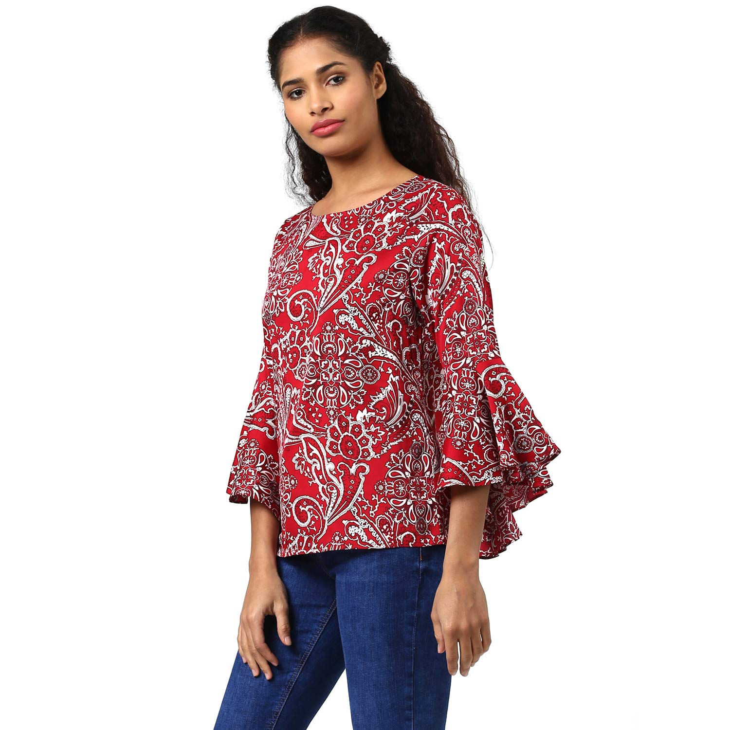 Red printed woven regular top, has a round neck, three-quarter sleeves