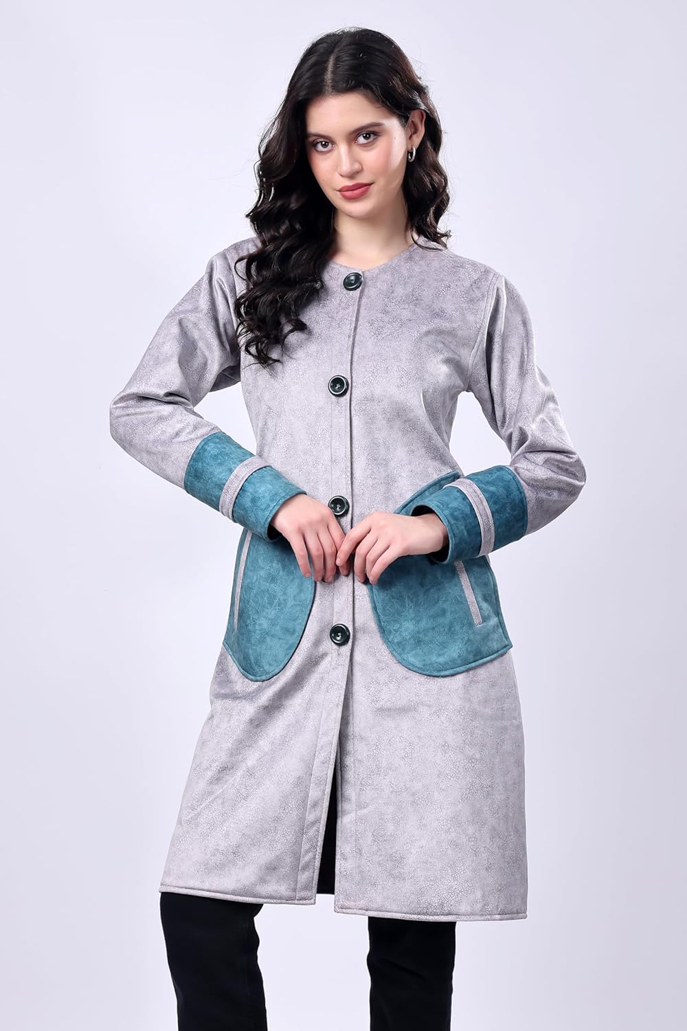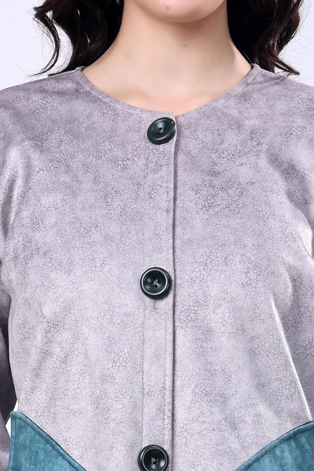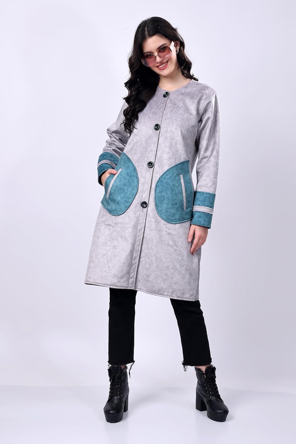 Elevate your winter wardrobe with this Grey and Blue Suede Coat, featuring a round neck, full sleeves, and a dual-tone design. With front button closure and practical pockets, it combines style and functionality, making it perfect for both casual outings and office wear during chilly days.