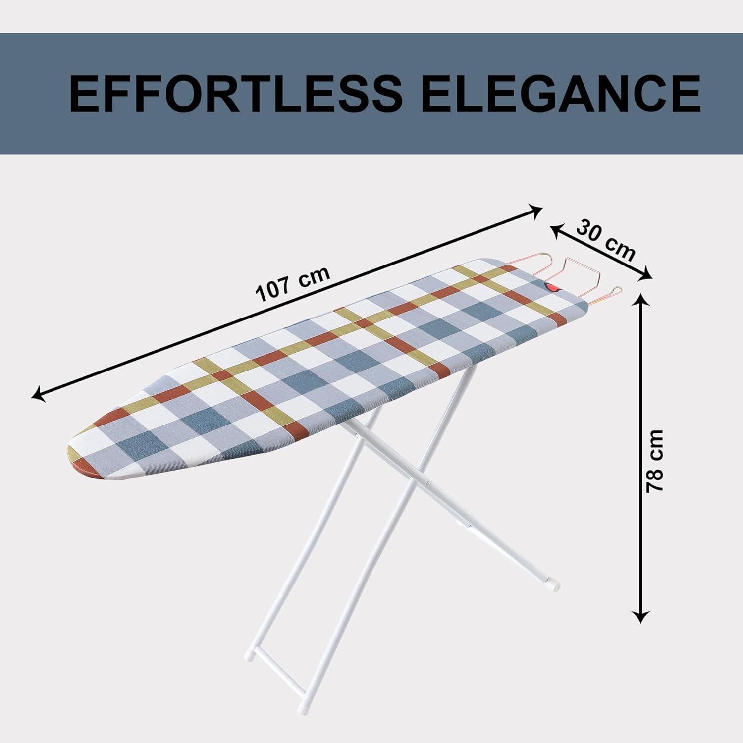 FOLDABLE-ADJUSTABLE AND EFFORTLESS ELEGANCE : This Board boasts a foldable design that keeps your laundry room clutter-free when not in use. But functionality doesn’t stop there. Unfold the board to reveal a generous ironing surface, perfect for tackling even the largest of wrinkles. Adjustable height settings ensure ergonomic ironing for all heights, And because style shouldn’t be sacrificed for function, the board features a lacquer-coated iron stand that elevates your laundry room aesthetic.