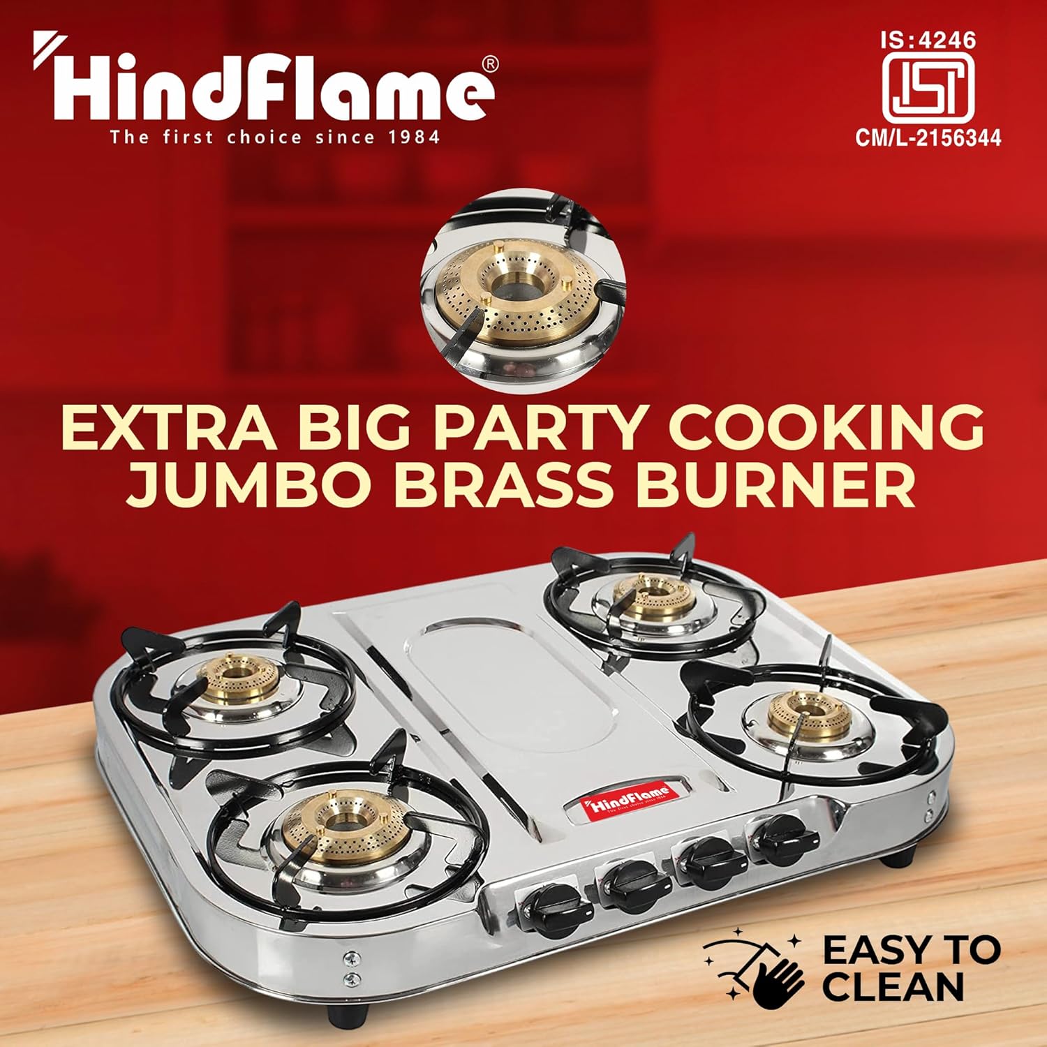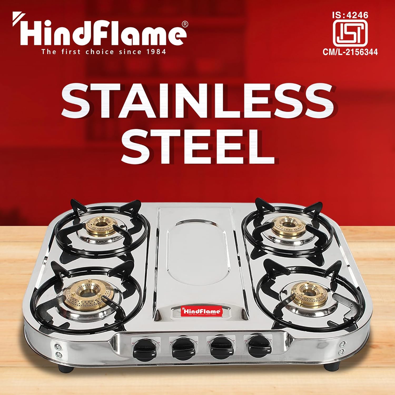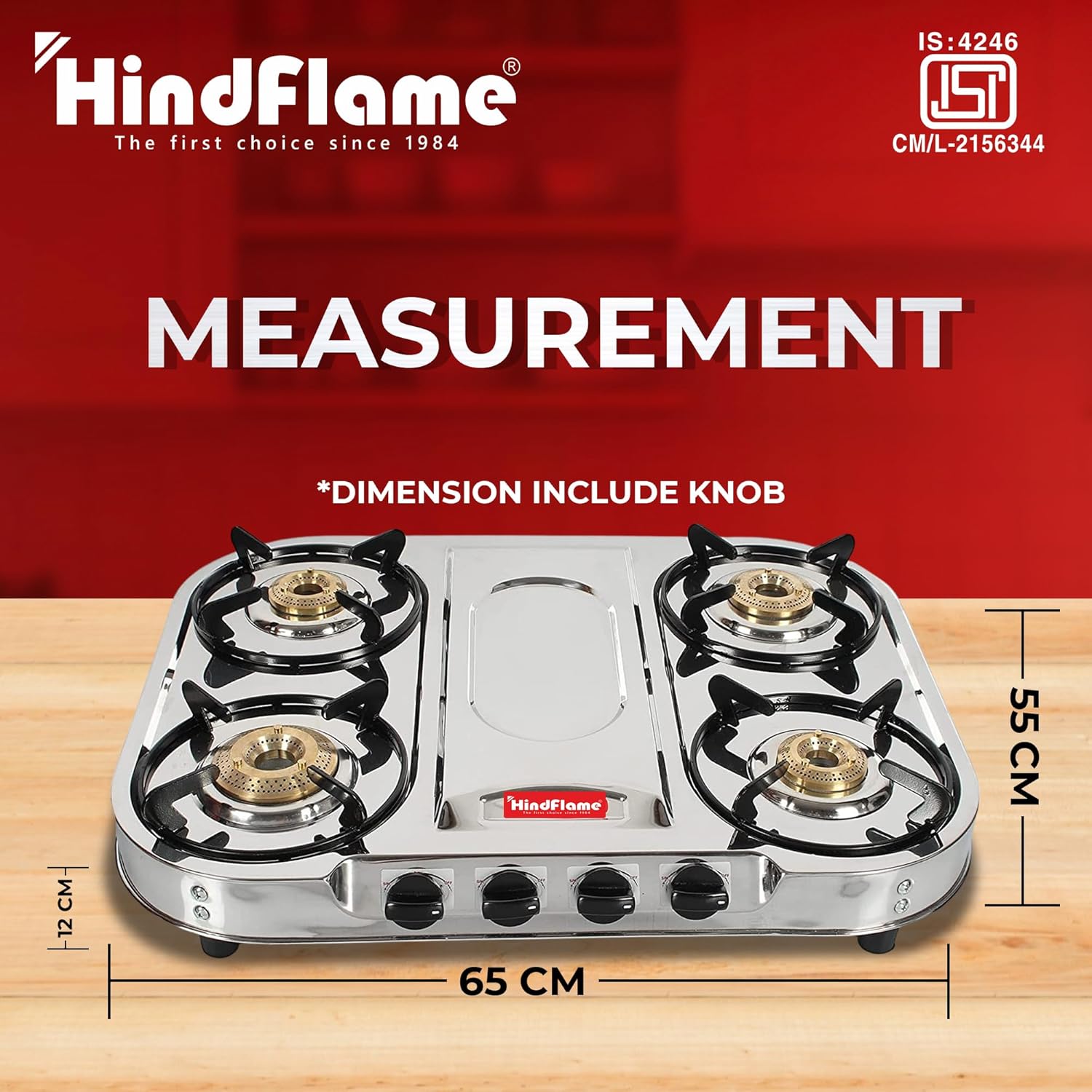 HINDFLAME, The Name Says It All..!! The stove is made with stainless steel that increase the overall strength of the stove and provides a robust and firm structure for convenient everyday use. The stove is designed with a universal pan size support that enables uniform cooking and accommodates all major pan sizes including heavy & large vessels.The high efficiency brass burners allows low gas consumption and helps in heat retention. It is equipped with 3 distinct sized of brass burners; 2 Small, 1 Big & 1 Extra Big for Party Cooking. The knobs are ergonomically designed for ease-of-use. Moreover, they are engineered to avoid leakage of gas to give you safe and efficient cooking experience. This Cooktop saves 15% of your Gas compared to others. It has lowest %age of carbon Monoxide & carbon dioxide is less than 0.02%, making it an eco-friendly cooktop. Hindflame cooktops are very easy to maintain & very low on pocket. This Gas stove runs on LPG. For PNG and other gases suitable alteration will be done by the respective gas companies. This Gas Stove is ISI Approved and Certified by BIS (Govt. Of India).