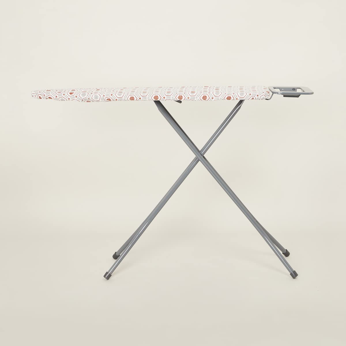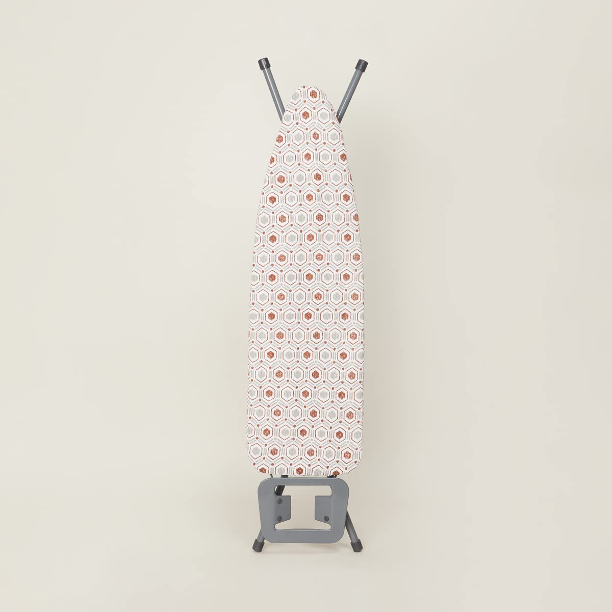 Simplify your laundry needs by bringing home this ironing board. It features a powder-coated steel and plastic frame with a mesh top, and a fabric and foam board. This ironing board comes with an iron rest and a heat-resistant silicone button. The cotton base allows easy ironing. The foldable design lets you save space when not in use.