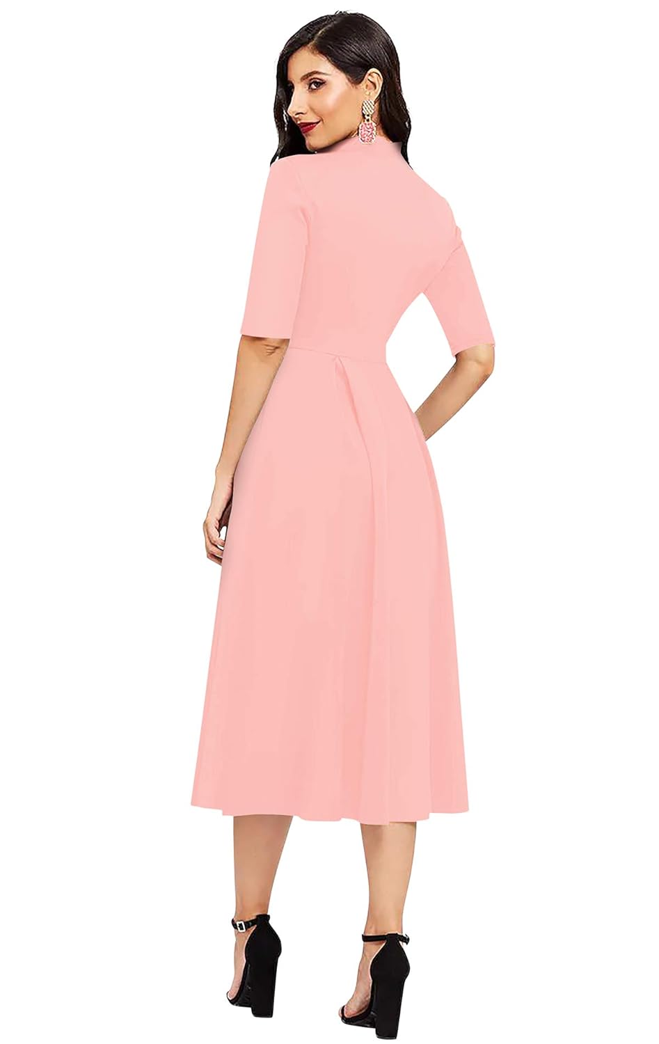 Customers find this dress to be a favorite in their wardrobe with amazing fit, and one customer notes the sleeve end is just above the elbow. The material is thick and nice, and customers find it comfortable and worth the price. The color receives mixed feedback, with some finding it good while others say it’s a bit dull. Customers disagree on whether the size is true to expectations.