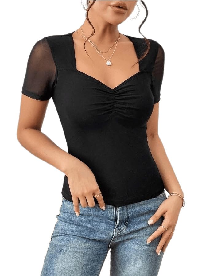 Discover the perfect blend of elegance and comfort with our Contrast Mesh Ruched Sweetheart Neck Top. Crafted from soft, stretchy fabric, this blouse offers a skin-friendly feel. Featuring a sweetheart neck and ruched front, it exudes subtle sophistication. Its slim fit silhouette and sheer mesh detail add a touch of allure to any outfit. Whether it’s a weekend getaway or a casual outing, this top is your go-to choice for effortless style.