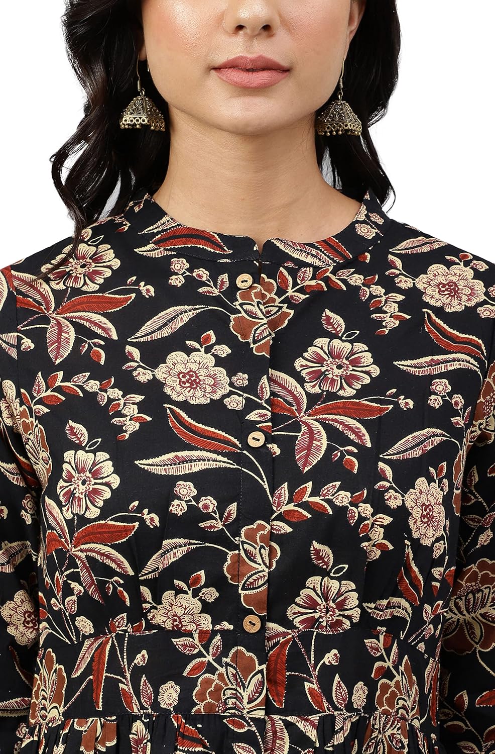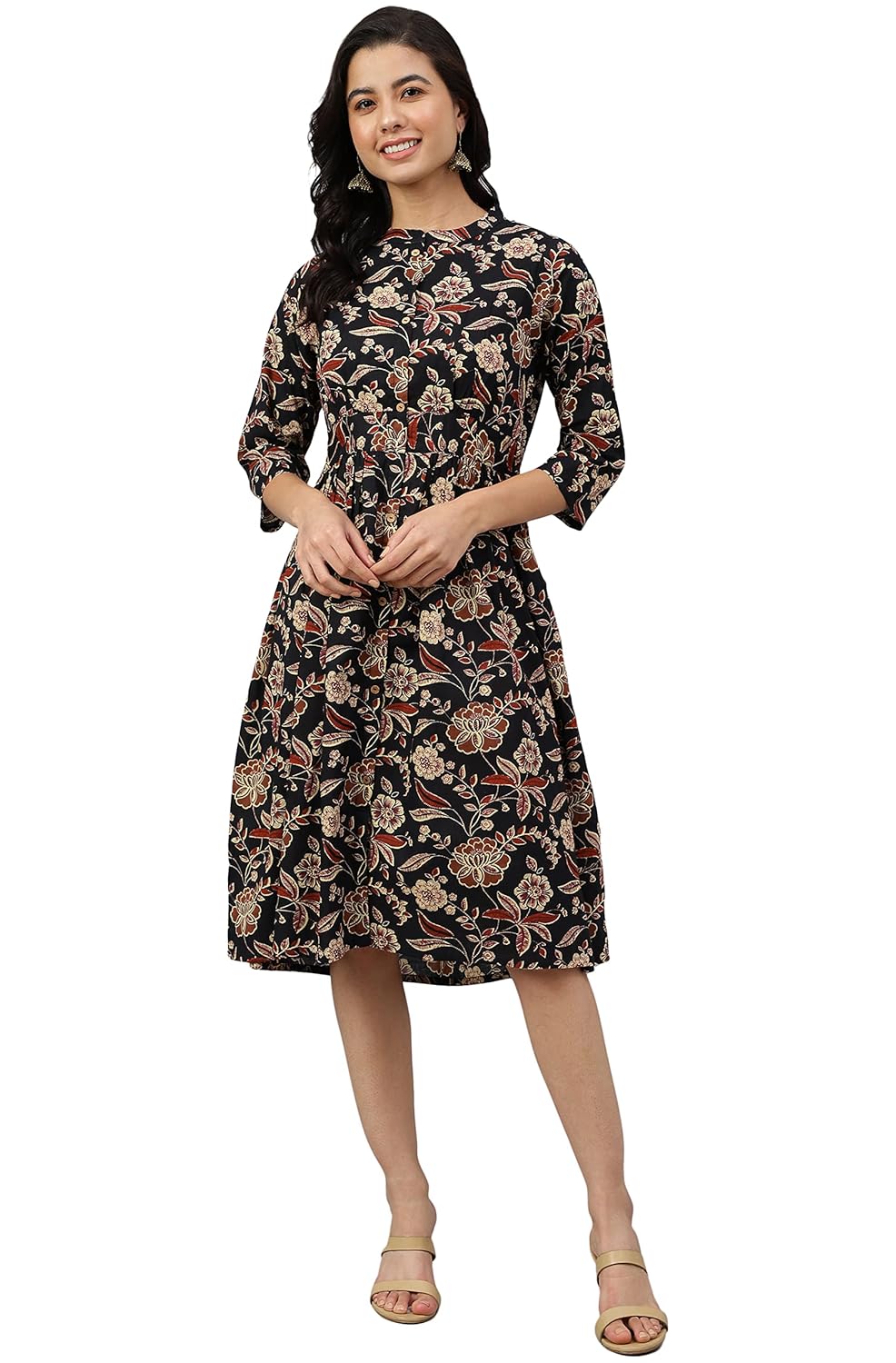 The black color cotton floral printed dress has chinese neck, 3/4 sleeves , and has flared silhoutte. Team it up with accessories to complete the look. It is perfect for day out.